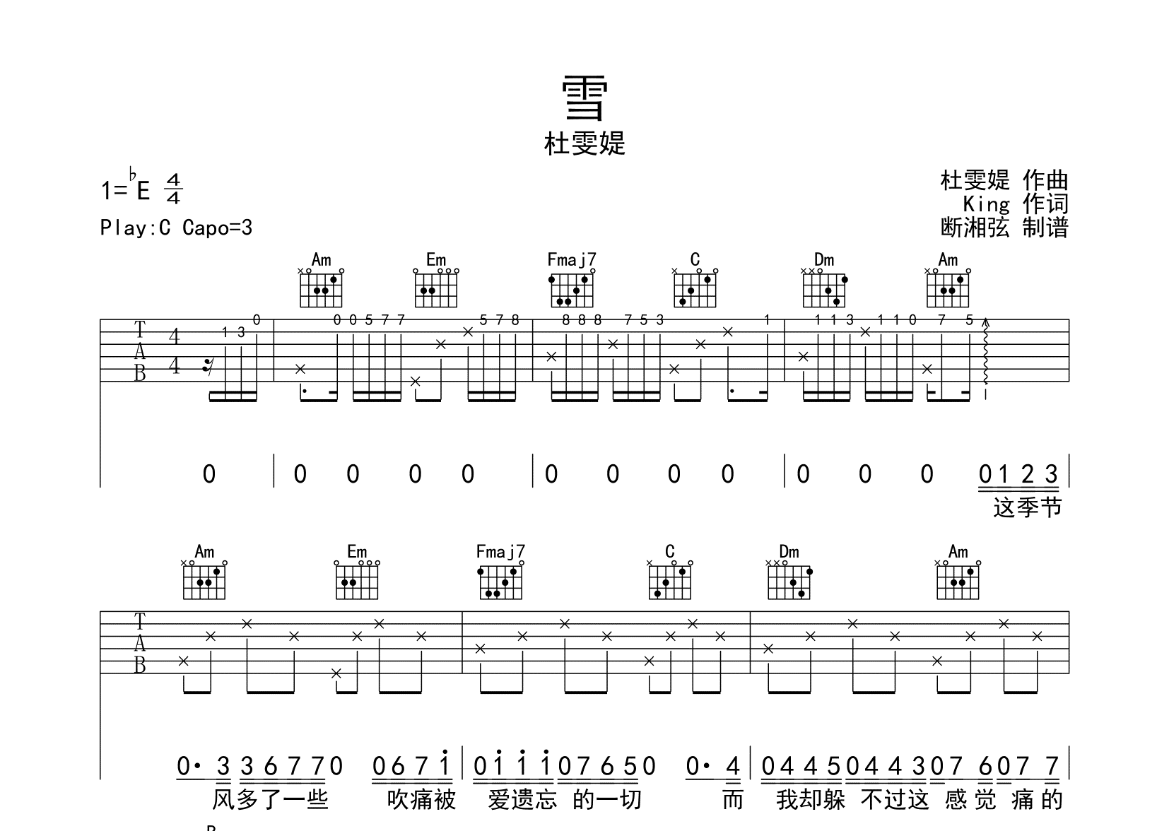 曲谱介绍: 雪吉他谱(杜雯媞),总共有4张高清图片谱,本谱为C调编配吉他谱,原调为bE,推荐变调夹夹3品弹唱原调,节拍4/4,速度为90拍每分钟,曲谱由本站创作者断湘弦制谱。