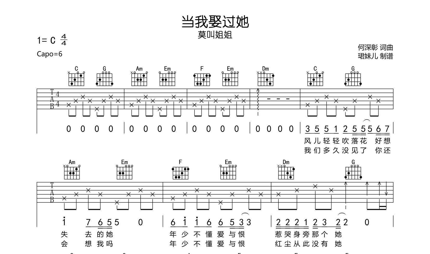 当我娶过她吉他谱 - 莫叫姐姐 - C调吉他弹唱谱