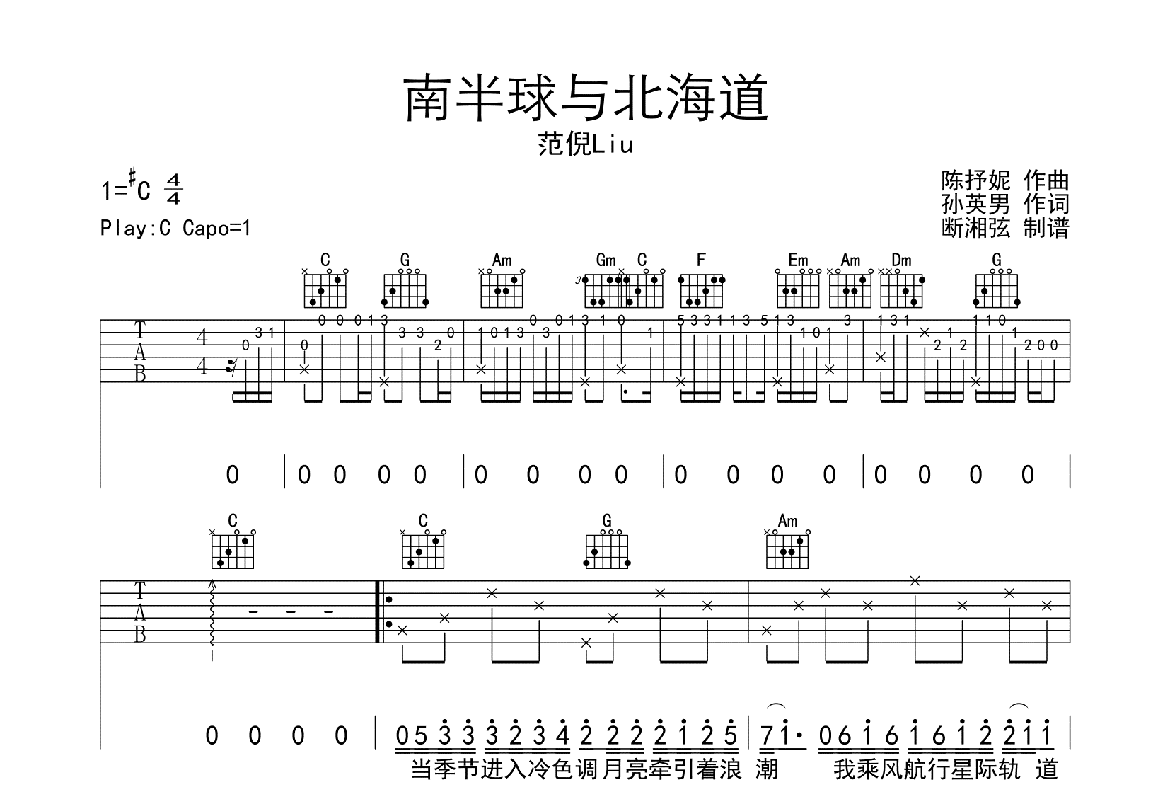 曲谱介绍: 范倪《南半球与北海道》吉他谱,总共有3张高清图片谱例,本谱为C调指法编配,原调#C,建议变调夹夹1品可弹唱原调,节拍4/4拍,速度为90拍每分钟,包含完整前奏,弹唱难度较为简单。