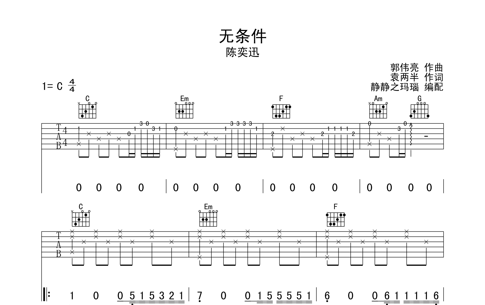 曲谱介绍: 由本站创作者静静之玛瑙编配的《无条件》吉他谱,选用C调指法,标准调音,可不用变调夹,包含完整的前奏,半分解和弦和扫弦节奏为本谱的主要节奏型,节拍4/4拍,速度每分钟70拍,弹唱难度较为简单。