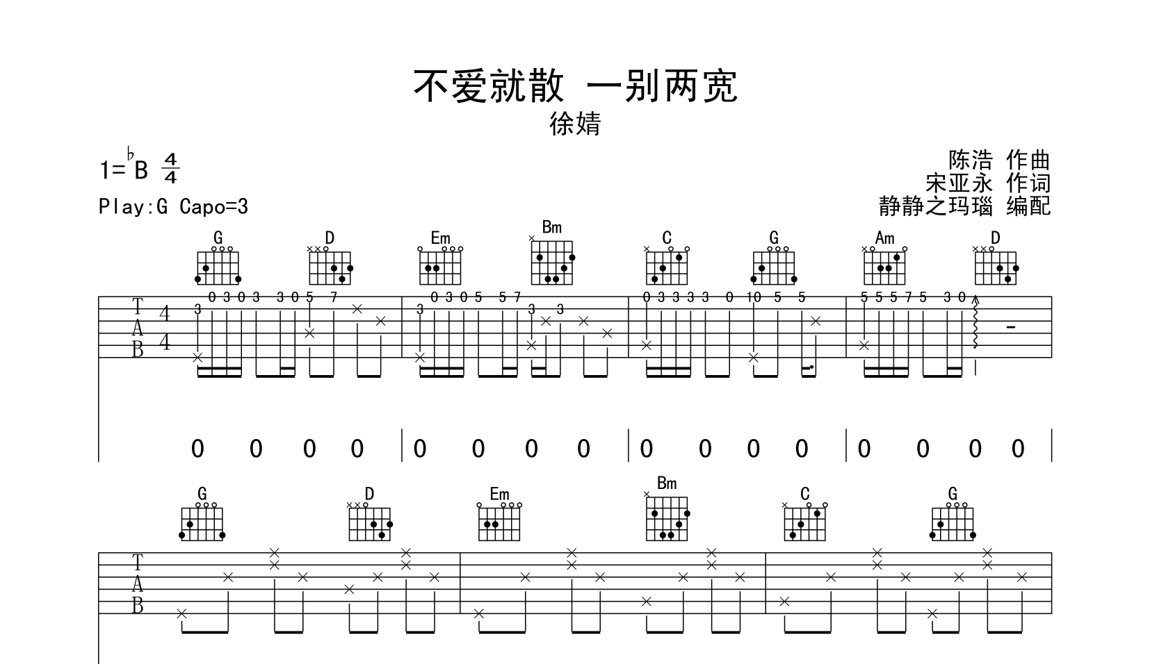 曲谱介绍: 不爱就散 一别两宽吉他谱,总共3张高清图片谱,原调bB,选用G调指法,变调夹推荐夹3品弹唱原调,节奏4/4拍,速度每分钟70拍,弹唱难度较为简单,曲谱由本站创作者静静之玛瑙编配制谱。