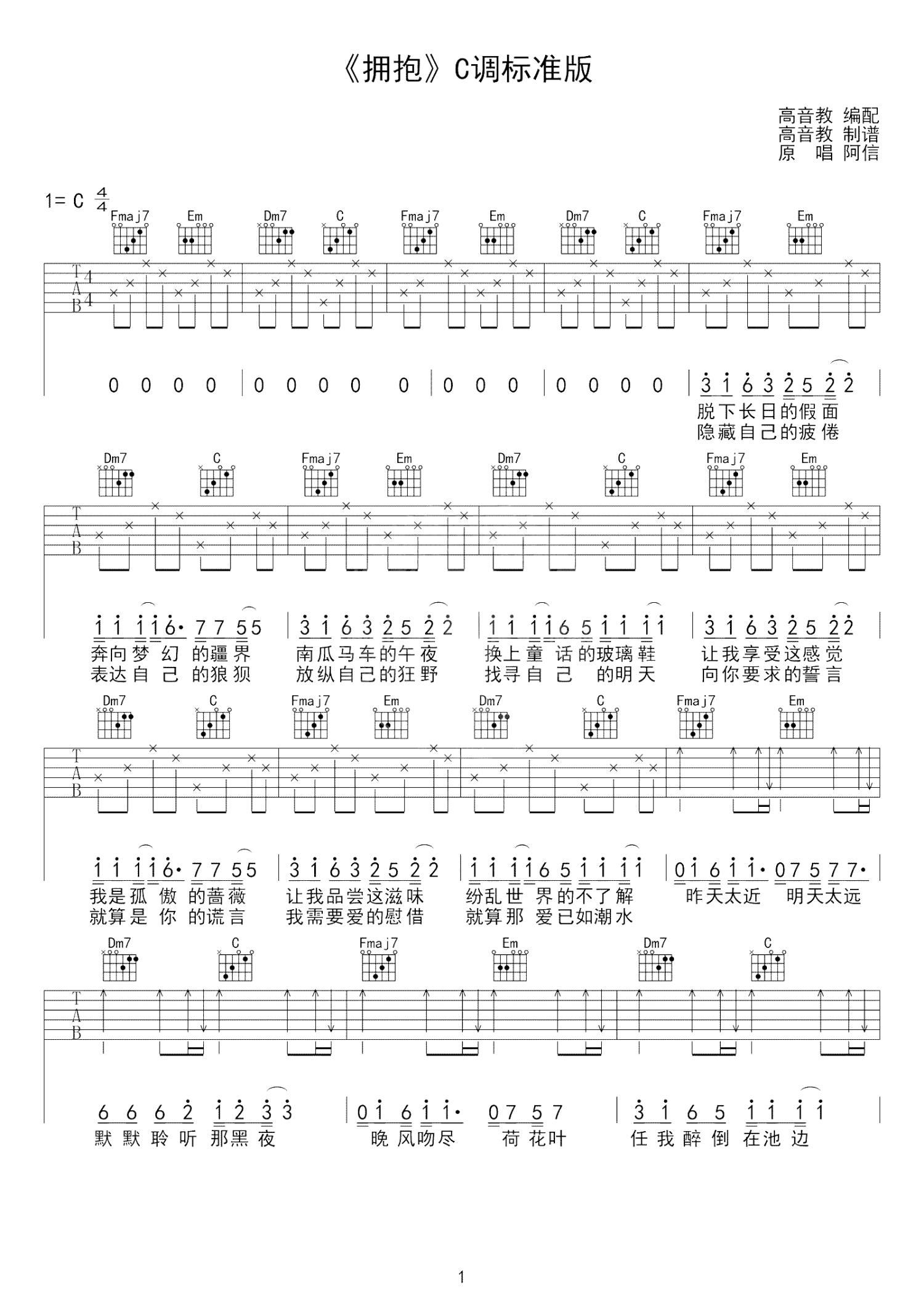 曲谱介绍: 拥抱吉他谱,C调标准版,五月天演唱的一首歌曲