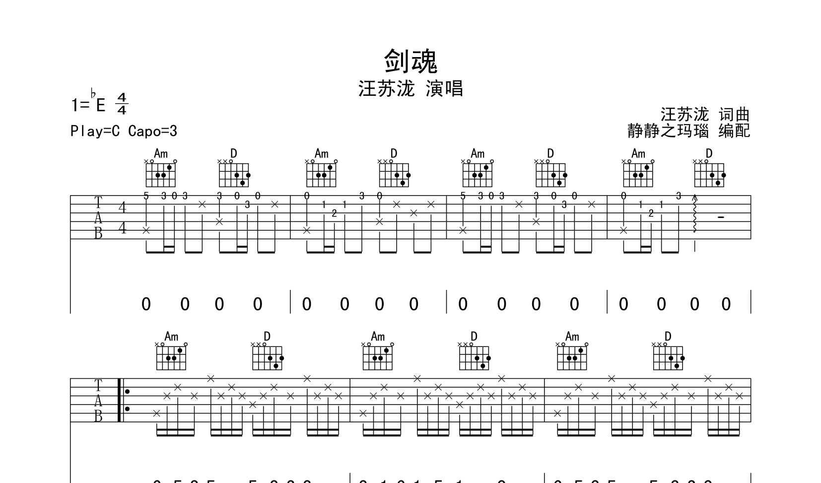 曲谱介绍: 剑魂吉他谱,总共3张高清图片谱,原调是bE调,选用C调指法,节拍4/4拍,速度每分钟90BPM,弹唱建议变调夹夹3品弹唱原曲调,弹唱难度初级,吉他谱由本站创作者静静之玛瑙制谱。