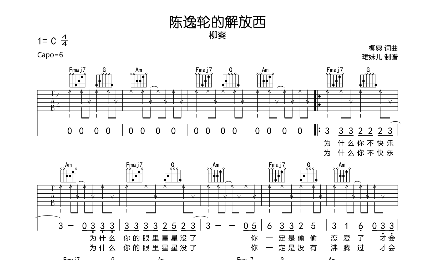 曲谱介绍: 柳爽《陈逸伦的解放西》吉他谱,总共3张高清图片谱,由本站创作者珺妹儿制谱,本谱采用C调指法编配,弹唱建议变调夹6品,速度120BPM每分钟,节拍4/4拍,弹唱难度较简单。