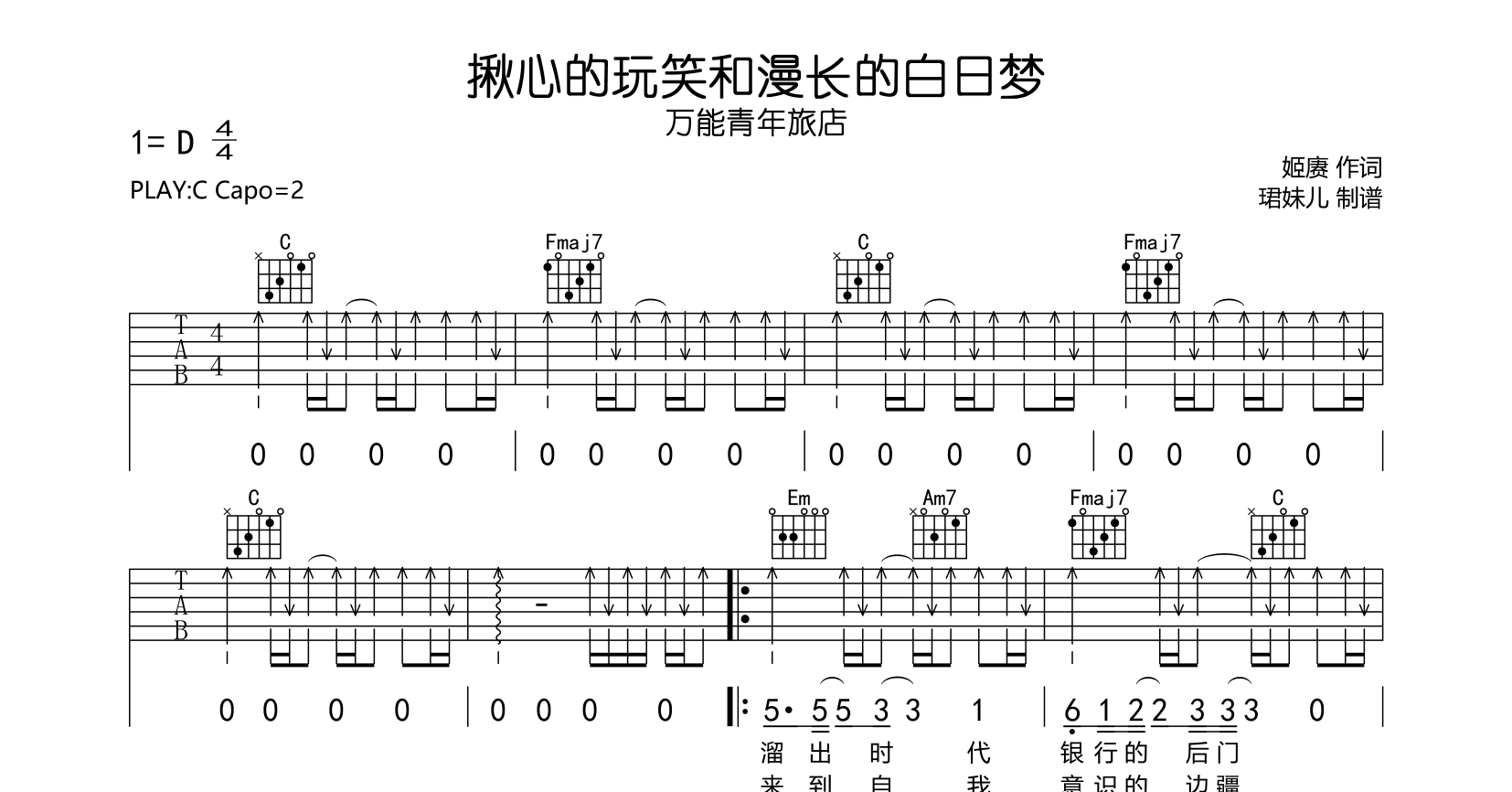 曲谱介绍: 揪心的玩笑与漫长的白日梦吉他谱,万能青年旅店演唱,《揪心的玩笑与漫长的白日梦》吉他弹唱谱,共有三张图片谱,本谱采用C调指法编配,弹唱建议变调夹2品,速度95BPM,节奏4/4拍,难度较简单,易上手,由@珺妹儿制谱。