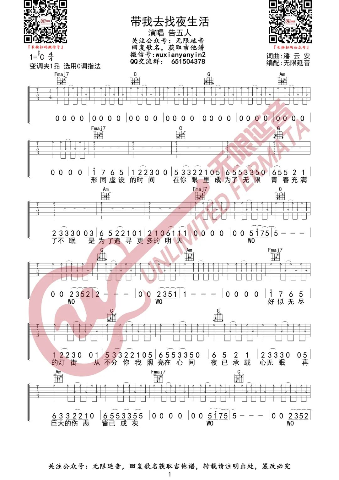 曲谱介绍: 告五人《带我去找夜生活》吉他弹唱谱,采用C调指法编配,共有3张高清图谱。