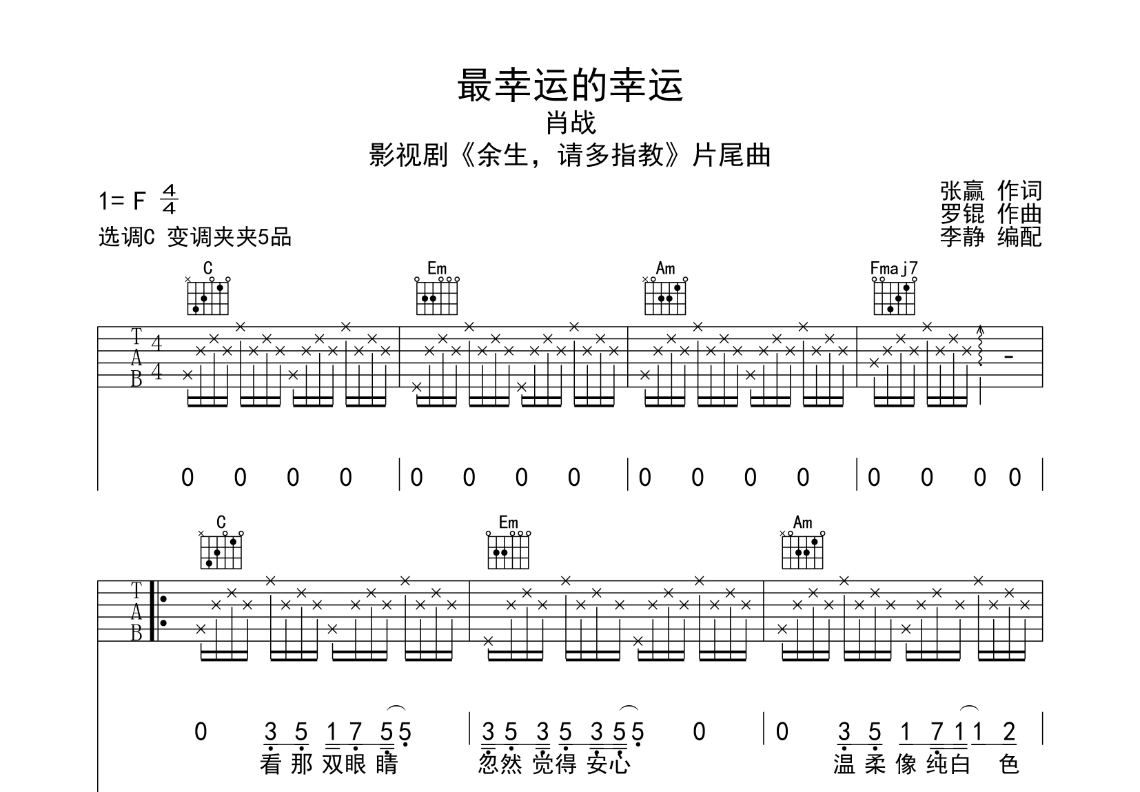 曲谱介绍: 肖战《最幸运的幸运》吉他谱,由@静静之玛瑙制谱,《最幸运的幸运》吉他弹唱谱,共三张图片谱本谱采用C调和弦指法编配,原调F调,弹唱建议变调夹夹5品,节奏4/4拍,曲速80拍每分钟,指法简单。