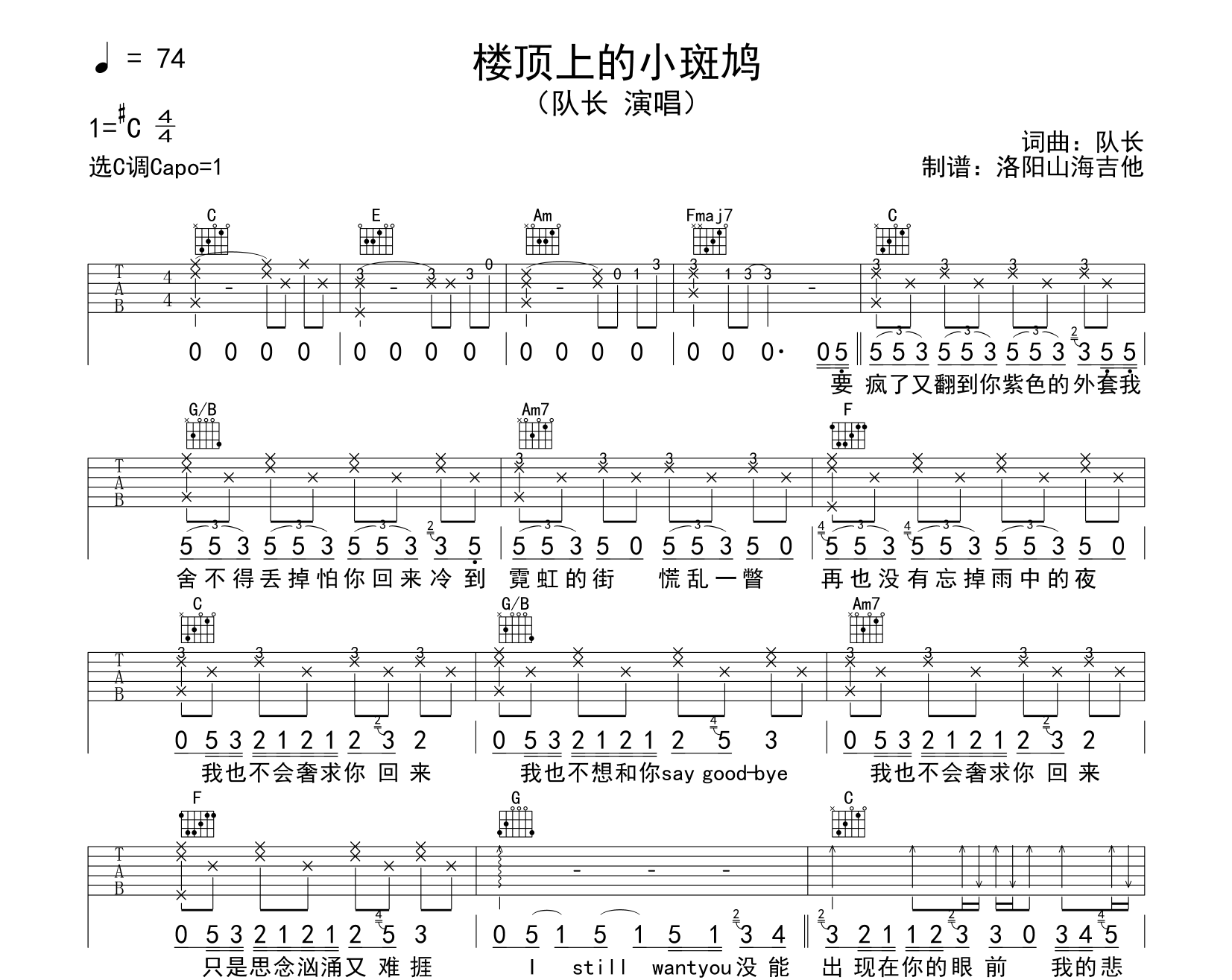 曲谱介绍: 队长《楼顶上的小斑鸠》吉他谱,由@飞韵吉他制谱,《楼顶上的小斑鸠》吉他弹唱谱,共有三张图片谱,选用C调指法,原调#C调,建议变调夹夹1品处弹唱,速度74BPM,节奏4/4拍,难度初级简单。