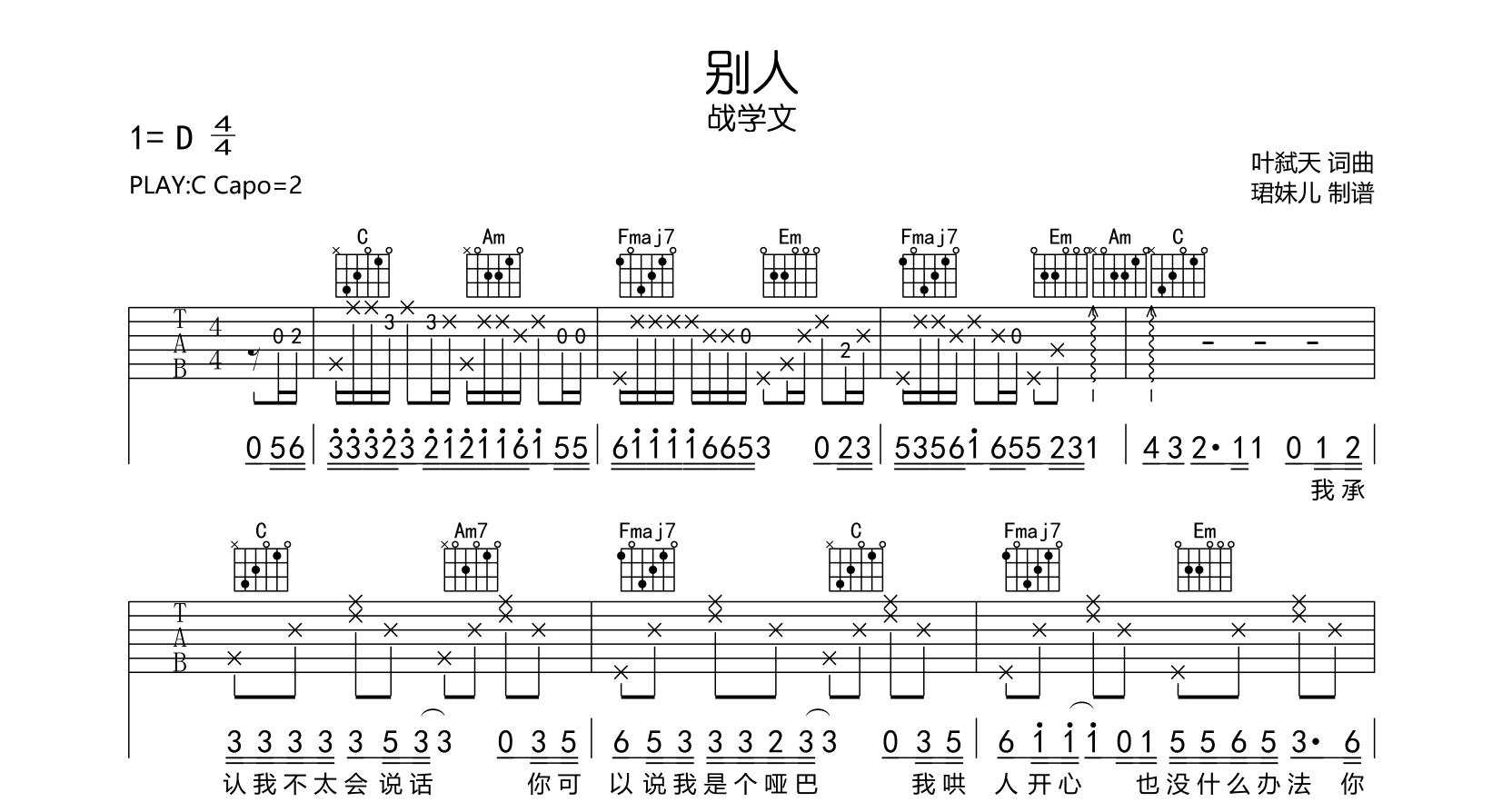 曲谱介绍: 别人吉他谱,战学文演唱,《别人》原版六线谱,本谱采用C调指法编配,原调D调,弹唱建议变调夹2品,速度85BPM,节奏4/4拍,难度较简单,易上手,本谱由珺妹儿制谱。