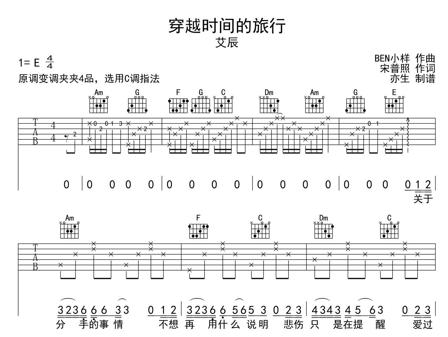 曲谱介绍: 穿越时间的旅行吉他谱,艾辰演唱,《穿越时间的旅行》原版六线谱,艾辰演唱,本吉他谱采用C调指法编配,节奏为4/4拍,原调E调,变调夹夹第4品演奏,演奏的速度控制在每分钟95拍左右,指法难度简单。