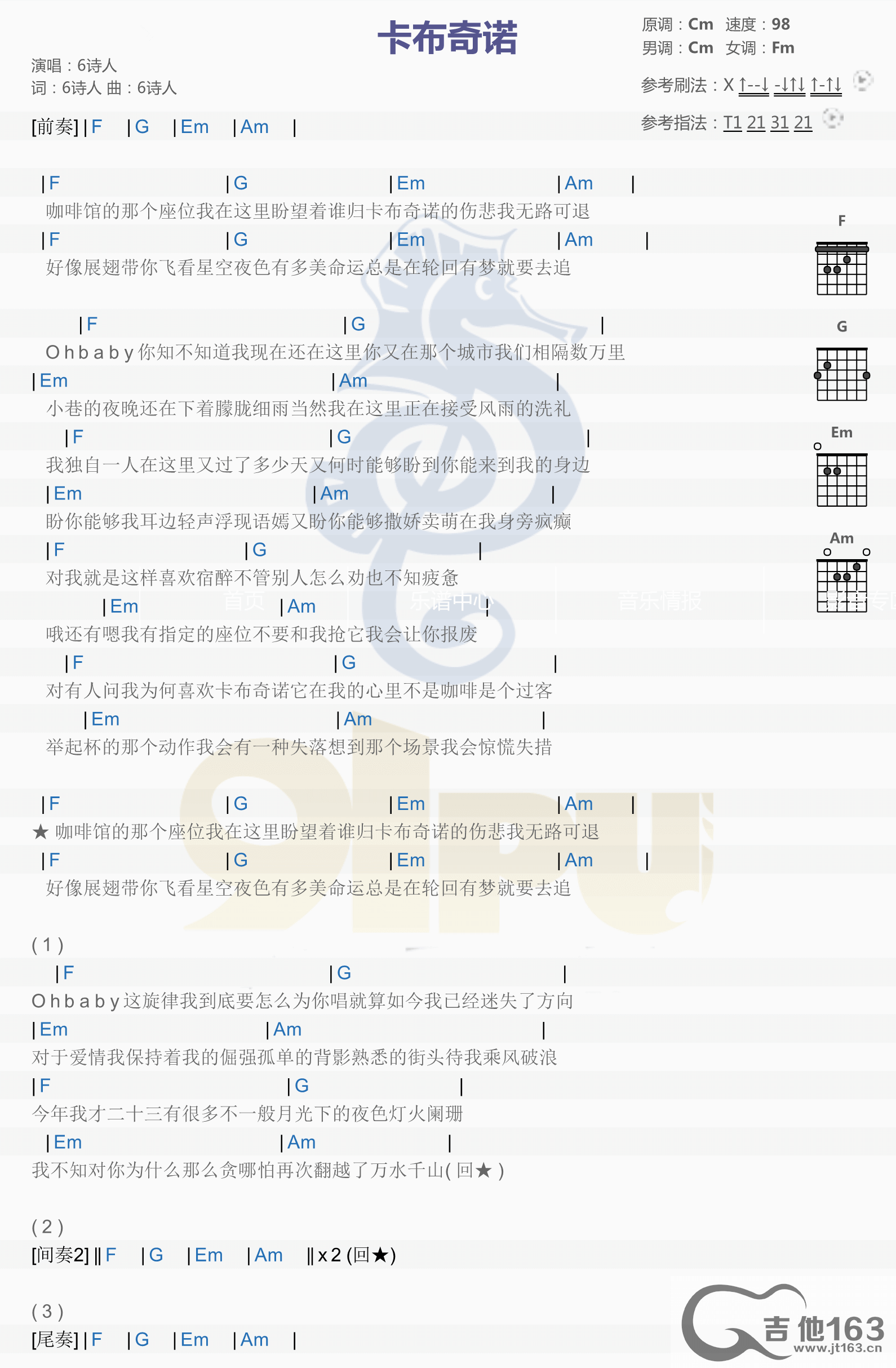 卡布奇诺吉他谱 - 6诗人 - C调吉他弹唱谱