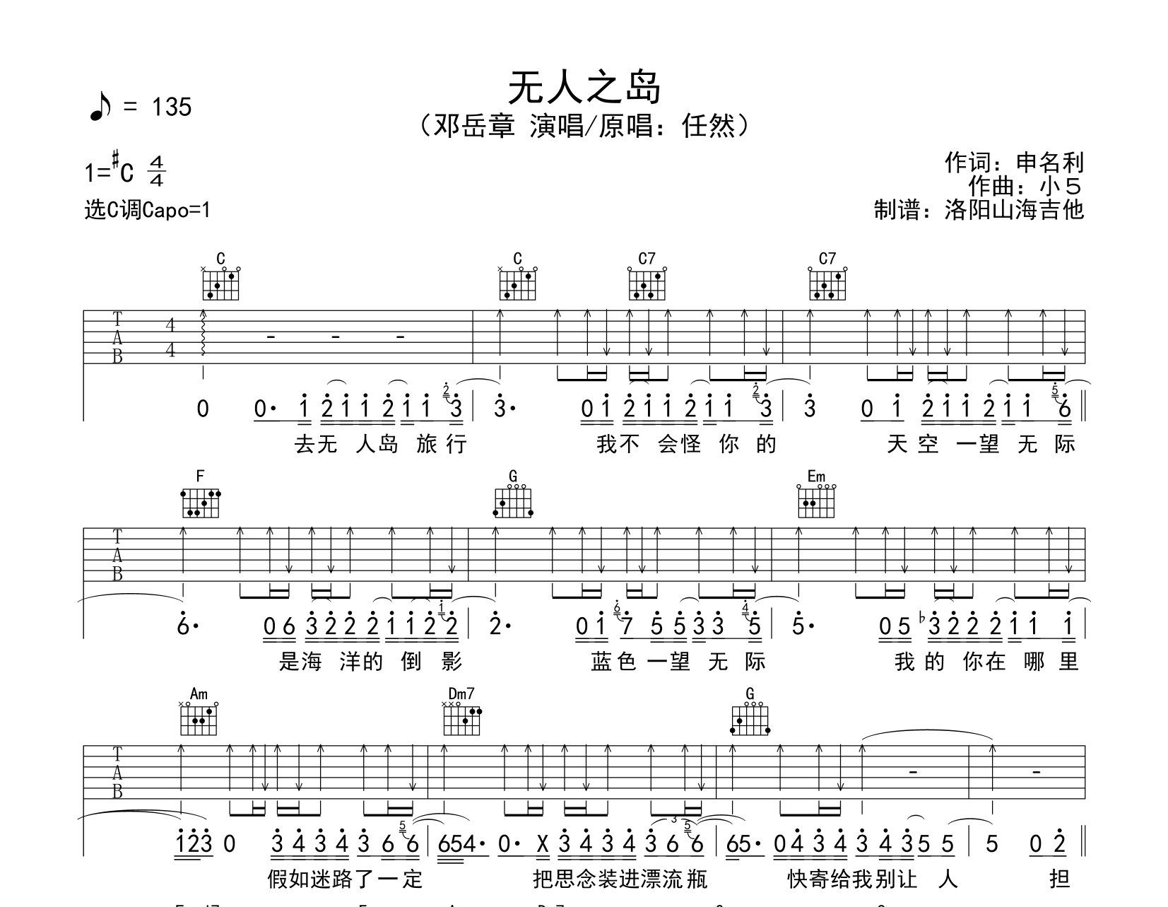 曲谱介绍: 邓岳章《无人之岛》吉他谱,由@飞韵吉他制谱,《无人之岛》吉他弹唱谱,共有三张图片谱,原唱任然,选用C调指法,原调#C,变调夹可夹在一品处弹唱,速度135BPM,节奏4/4拍,难度初级简单。