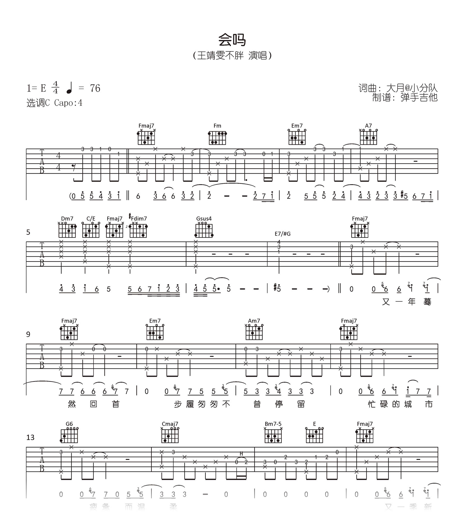 曲谱介绍: 每一个终点,都是起点,就像地图出发,到达,再出发。《会吗》吉他弹唱谱,六线谱共三张高清图片谱。原调E选调C,CAPO夹四品。