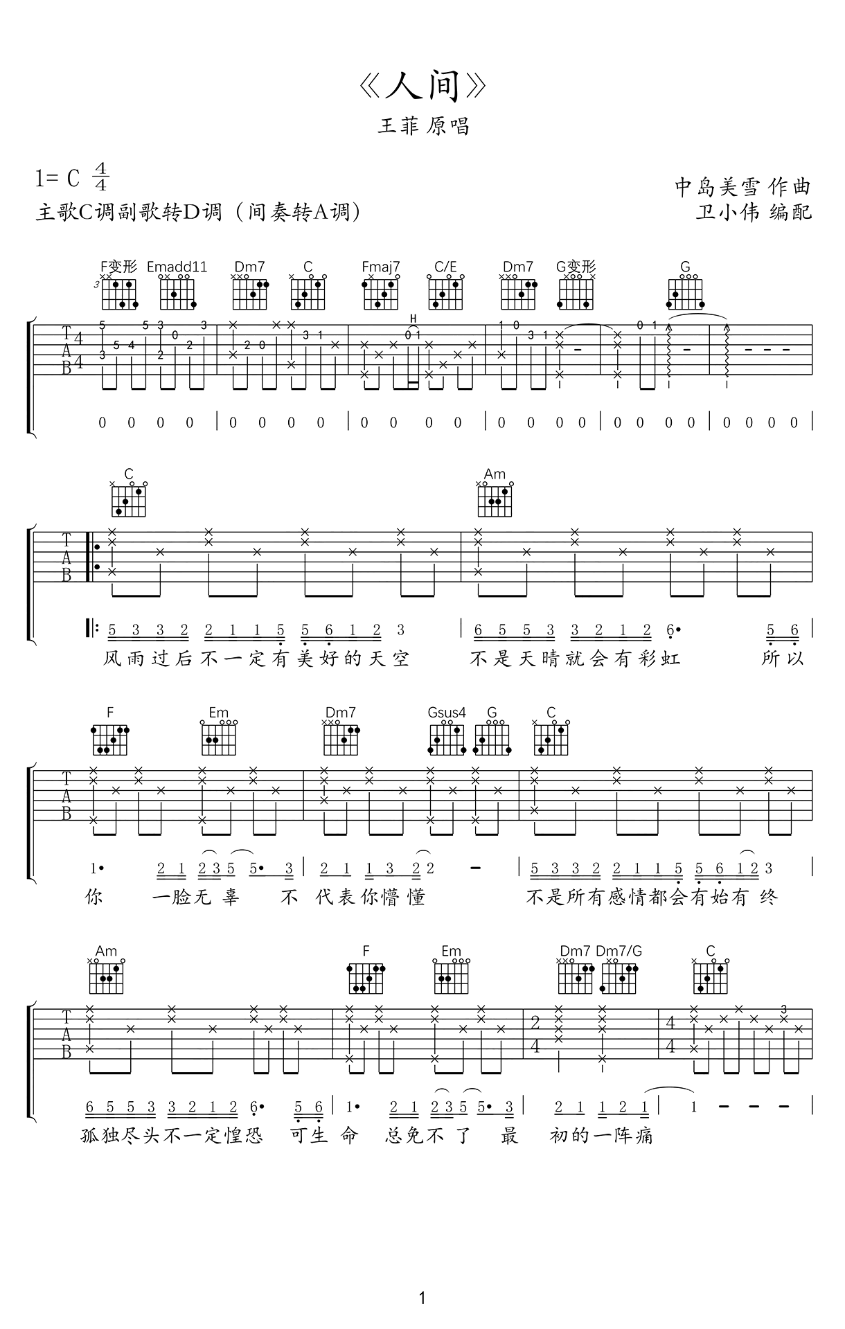 人间吉他谱 - 王菲 - C调吉他弹唱谱 - 原版