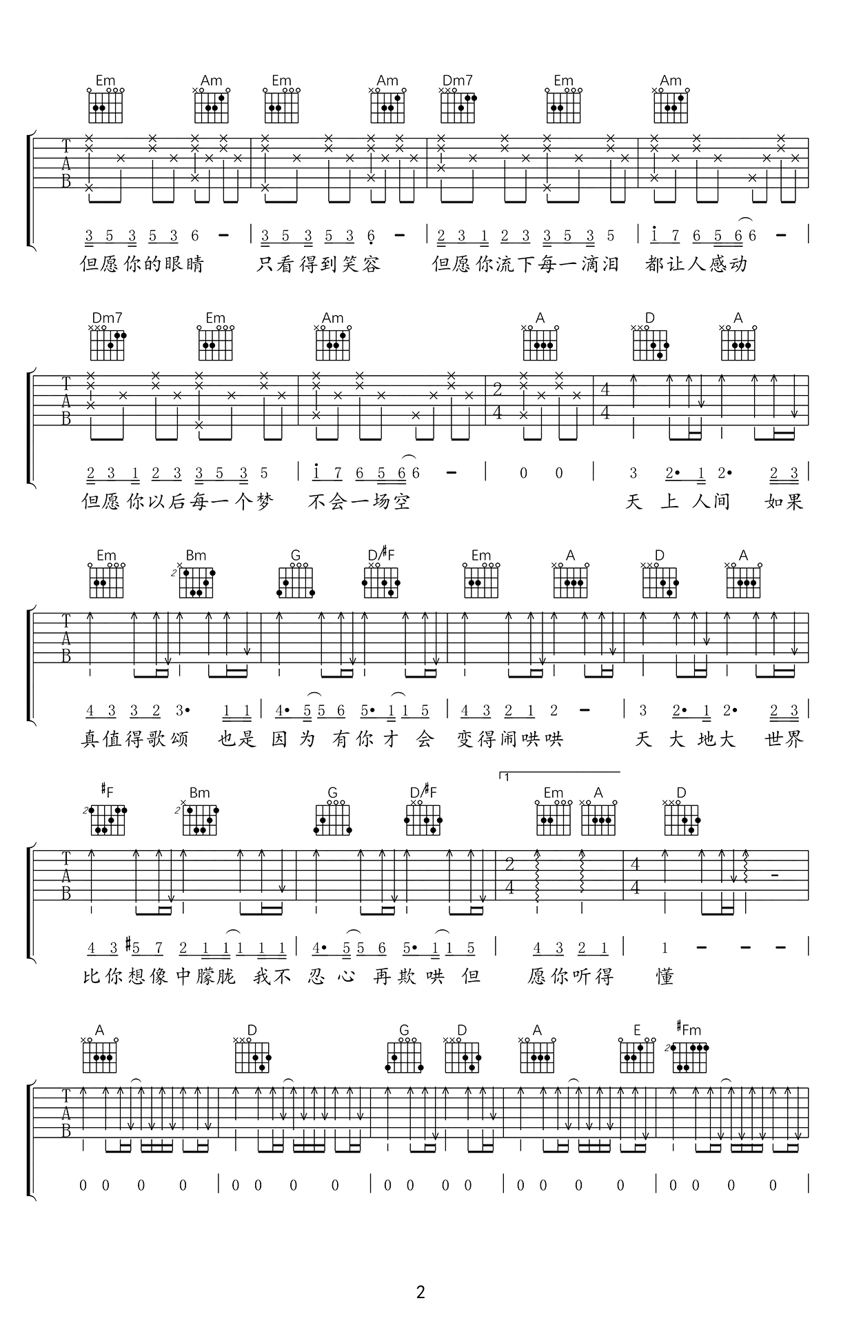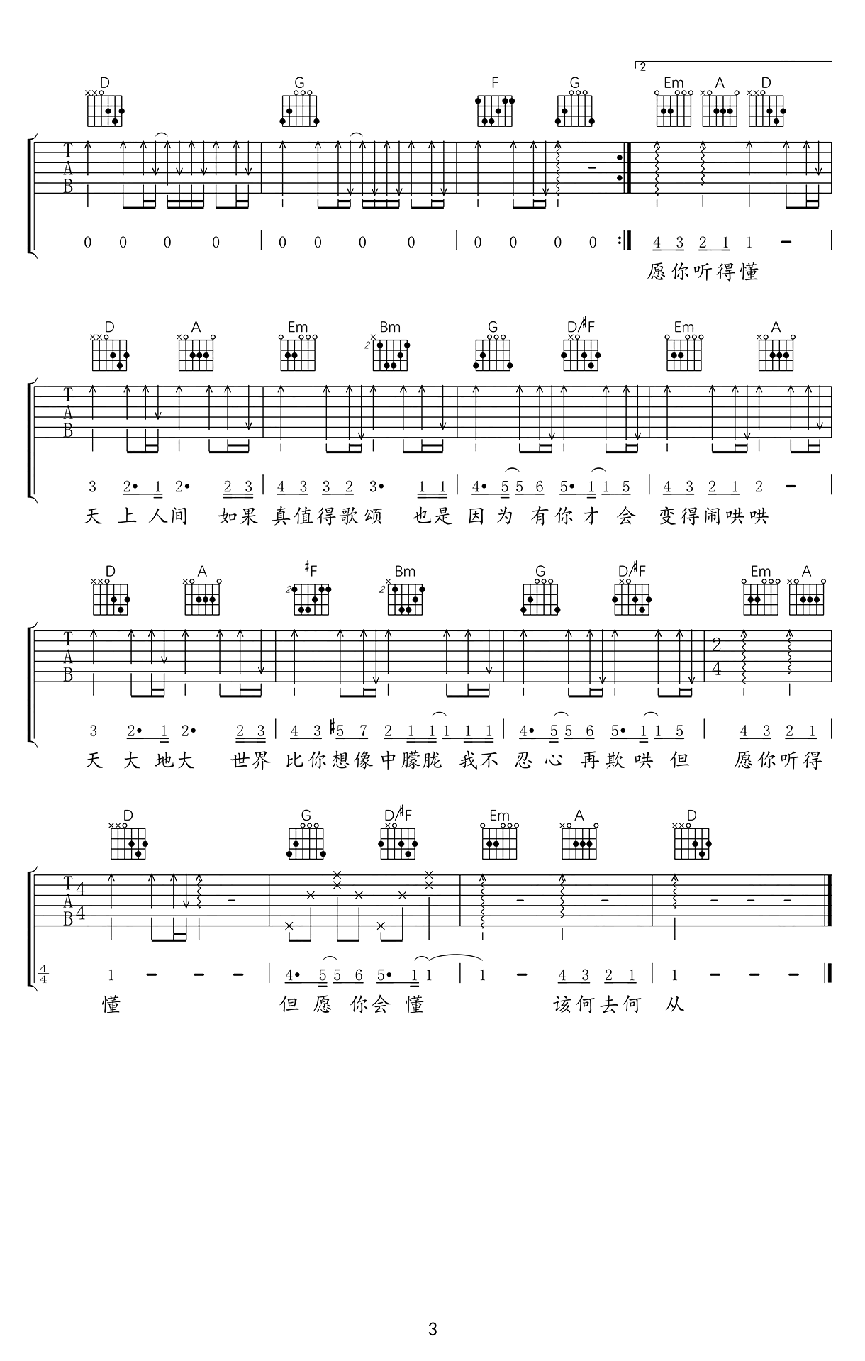 曲谱介绍: 《人间》吉他弹唱谱,原曲C转D,间奏转A调,还原度高,包含前奏、间奏(扫弦),难度不高,有横按。