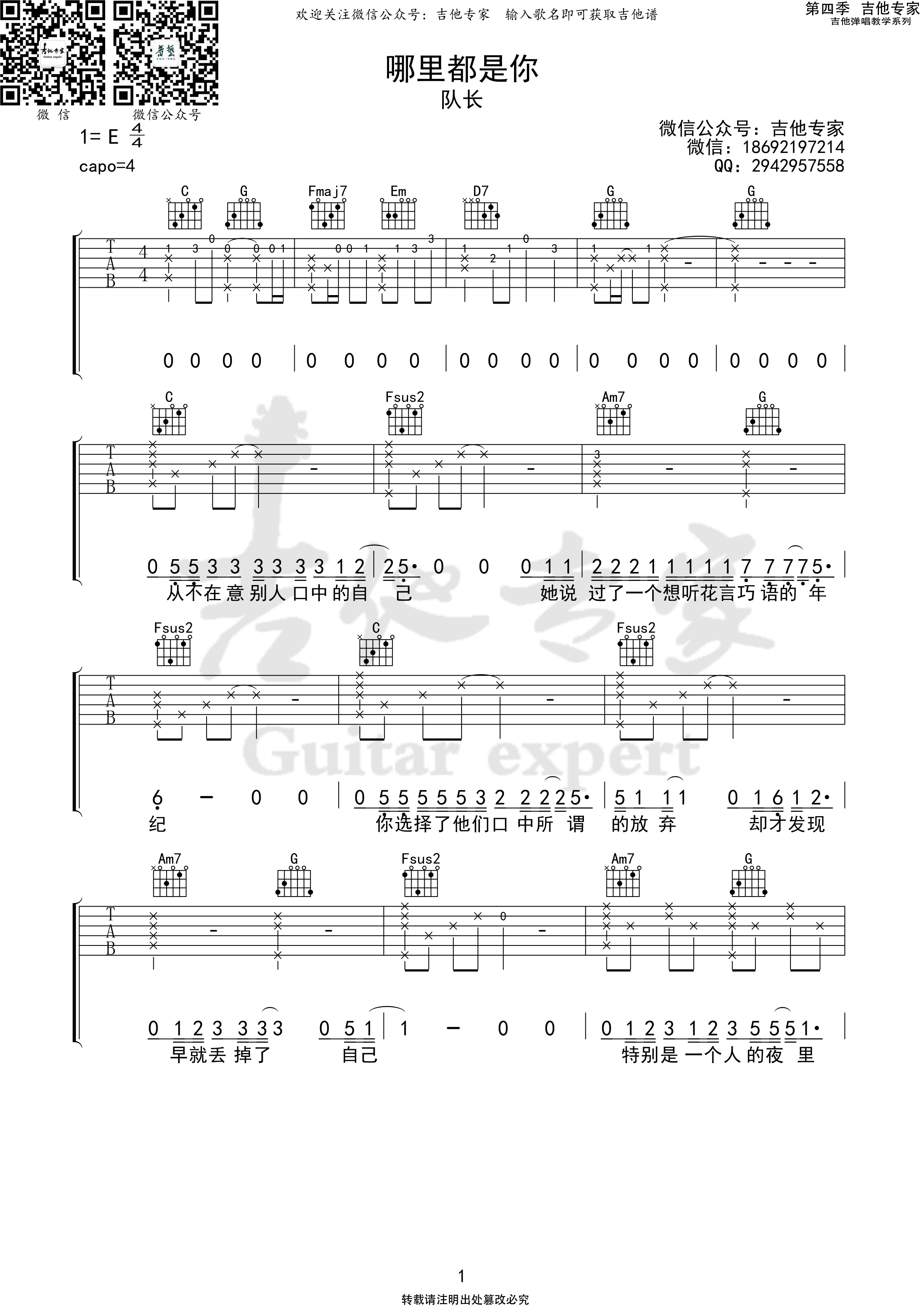 曲谱介绍: 队长《哪里都是你》吉他弹唱谱,采用C调指法编配,共有5张高清图谱。