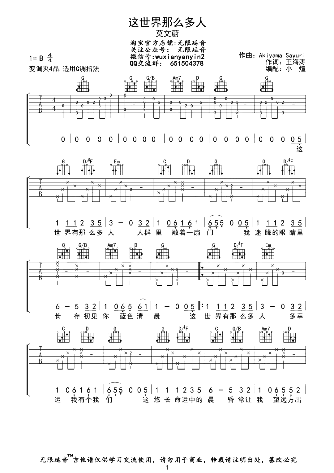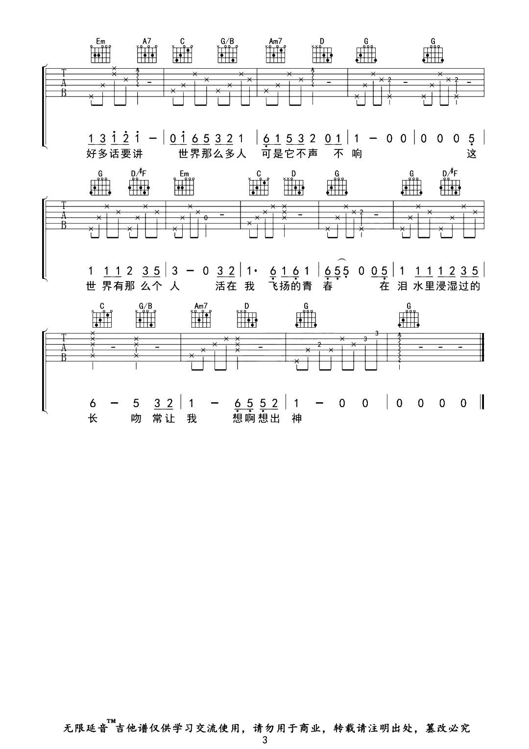 曲谱介绍: 莫文蔚《这世界那么多人》吉他弹唱谱,采用G调指法编配,共有3张高清图谱。