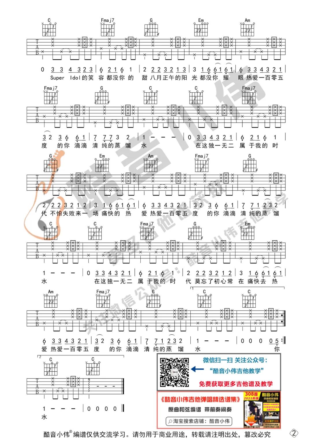 曲谱介绍: 这首曲谱由酷音小伟编配制谱,总共2张高清图片谱,原调是bB,选用C调指法,男生0-4品变调夹,女生可以不用夹变调夹,节奏型还是非常符合这首歌曲的节拍,之前上传的几个版本难度都不算大,大家可以结合教学视频练习(稍后会更新),然后参考选择适合自己的一个弹唱版本进行练习。