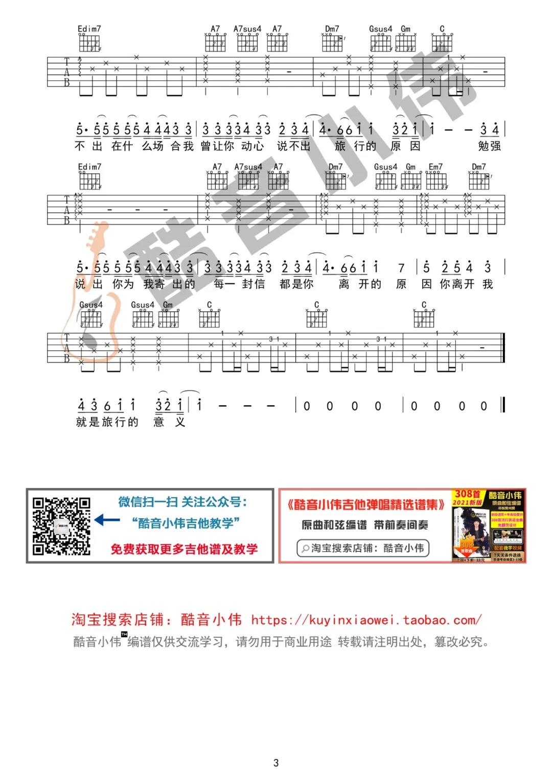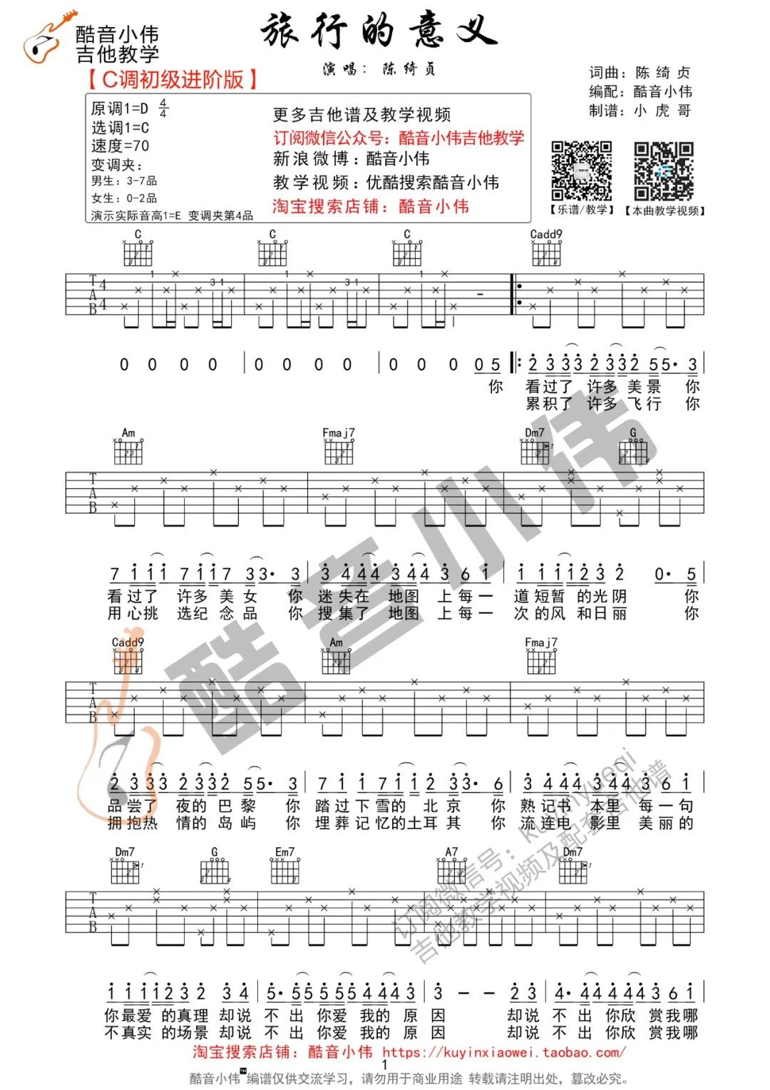 曲谱介绍: 曲谱由酷音小伟编配制谱,原调D调,选用C调指法编配,标准调音,女生0-2品,男生3-7品,根据自己的实际音域音高选择变调夹弹唱,下方有男生版的弹唱演示视频为E调,变调夹夹在第4品,整体弹唱难度不大,还原度比较高。 《旅行的意义》吉他弹唱演示