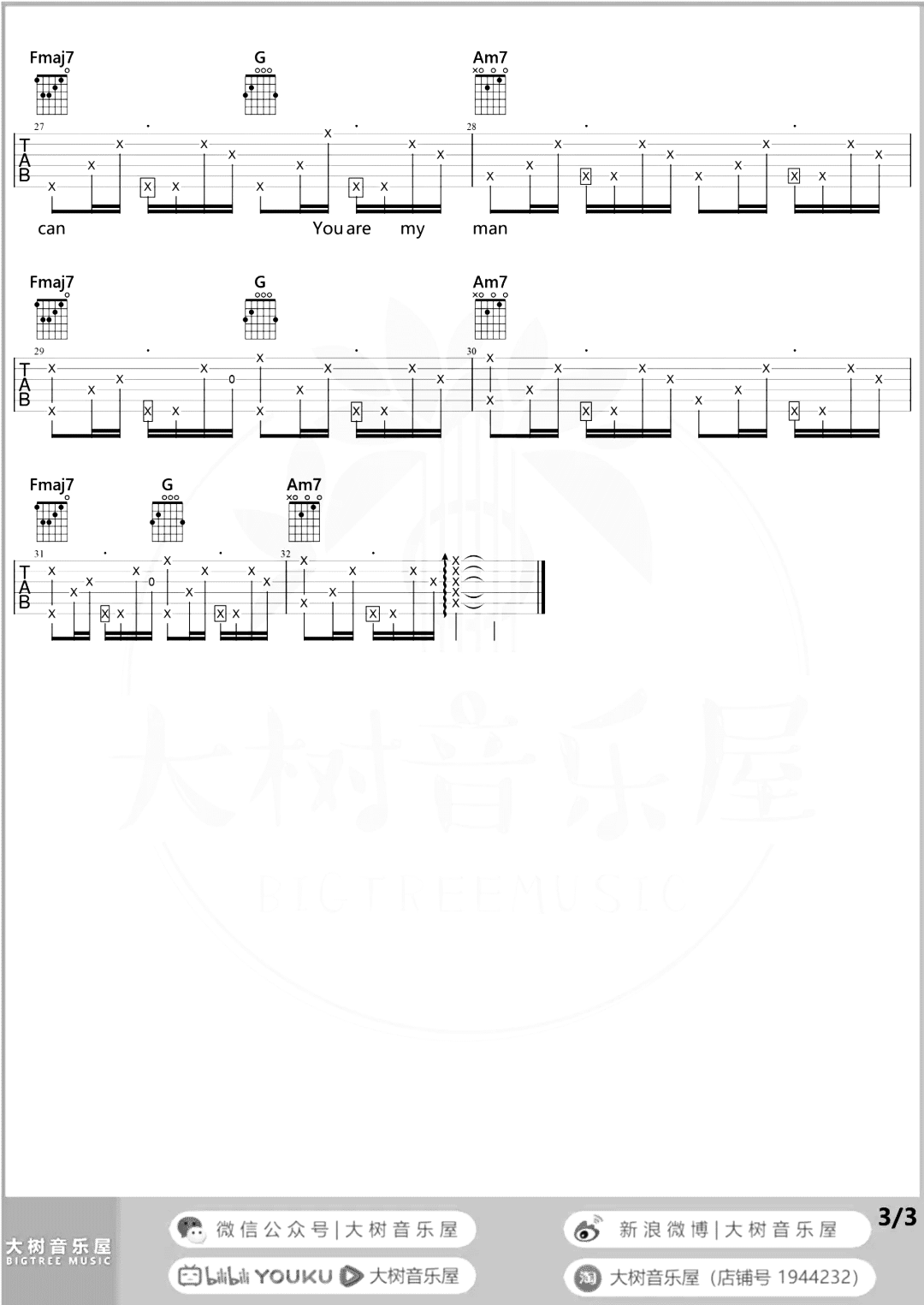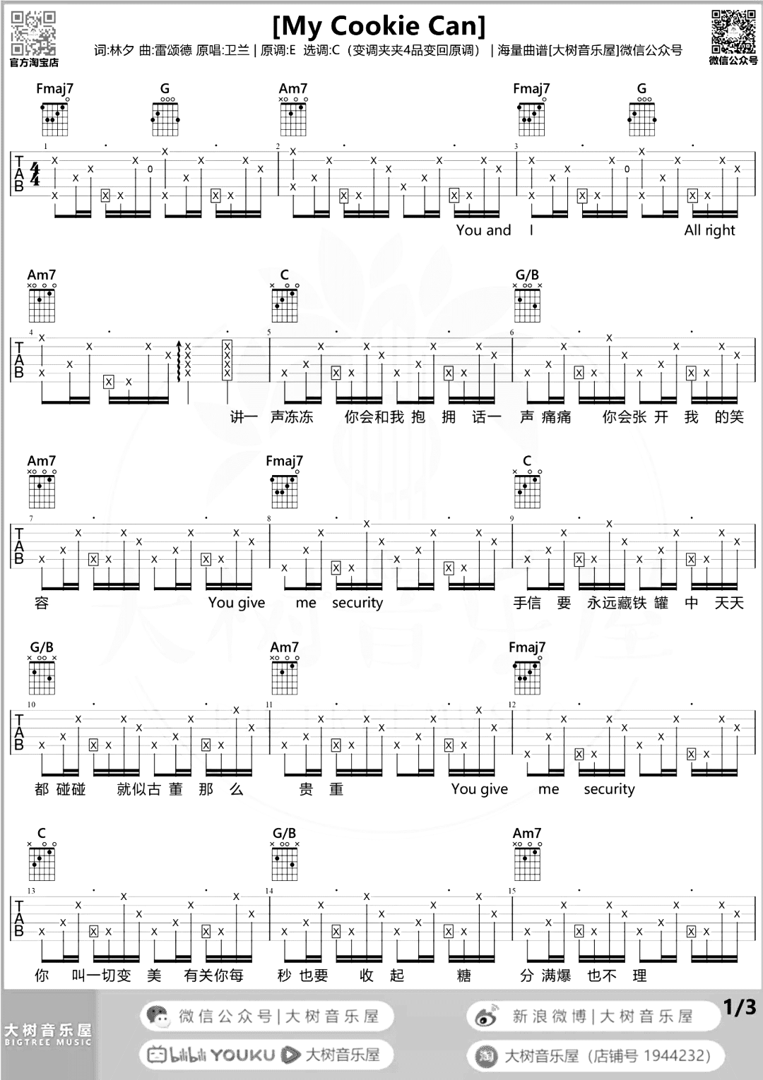 曲谱介绍: 《My Cookie Can》这首曲谱由大树音乐屋编配制谱,原调是E调,选用C调指法,变调夹可以夹4品弹唱原调,节奏感在这首歌曲的表现特别明显,节拍较快的分解和弦搭配拍弦,会让这首歌格外有氛围,可以参考下方吉他弹唱演示来配合练习。 《My Cookie Can》吉他弹唱演示