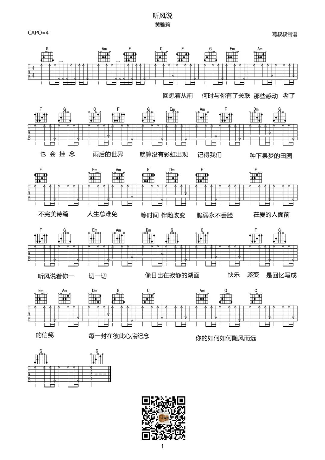 曲谱介绍: 这首曲谱共1张图片谱,选用C调指法编配,原调是E调,变调夹夹4品弹唱原调,扫弦为主要的右手节奏型,难度并不大,注意把握好扫弦的层次感和力度即可,如果对歌曲不太熟悉的,可以看看黄雅莉在之前节目中即兴弹唱《听风说》视频。 《听风说》吉他弹唱演示视频