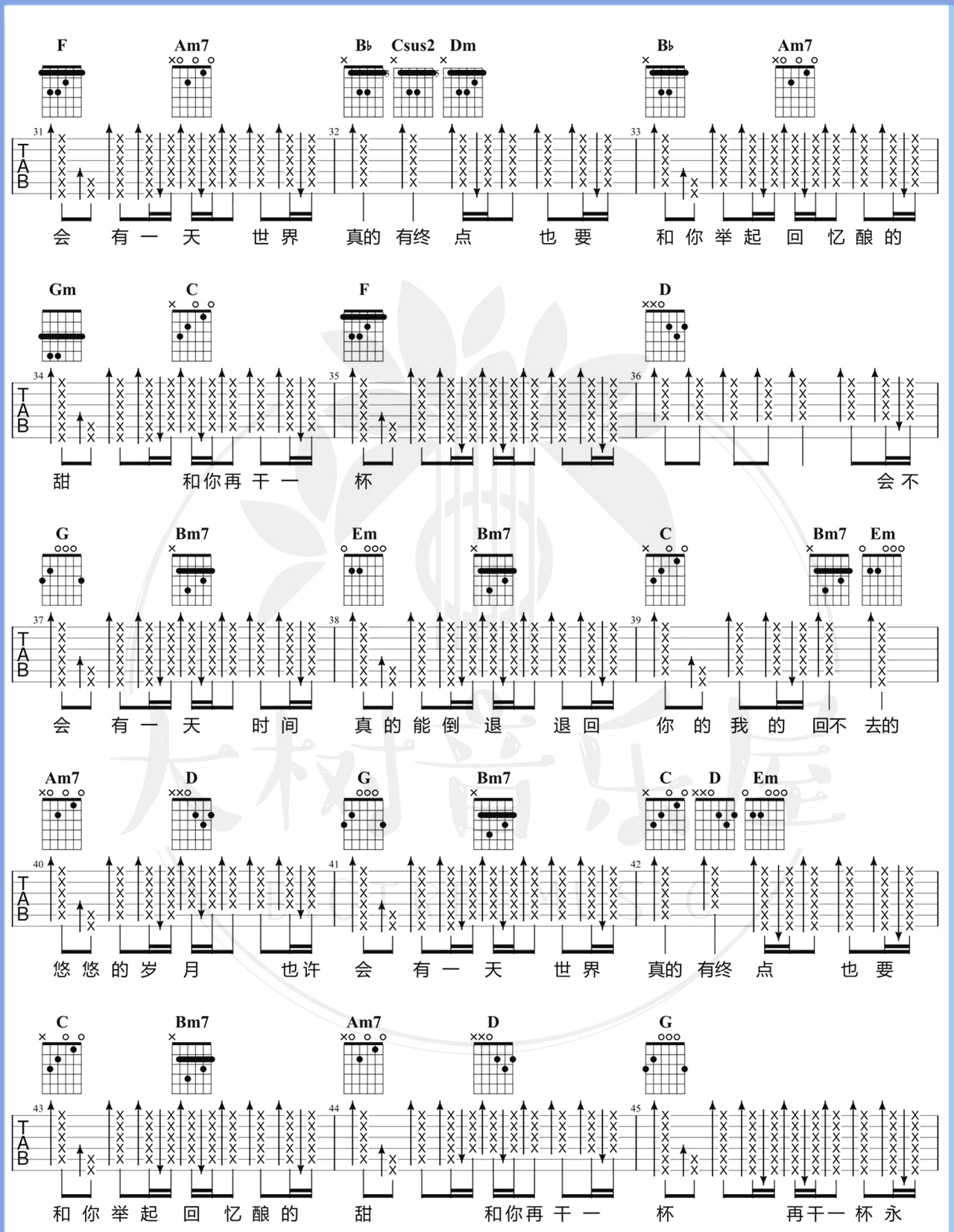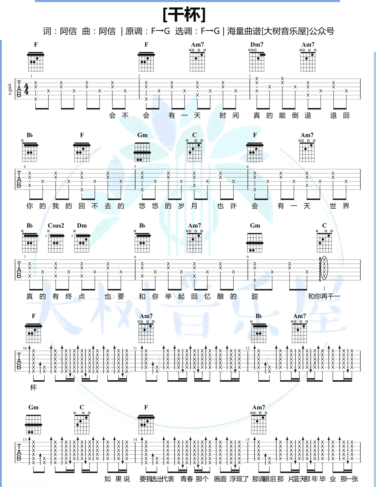 曲谱介绍: 这首曲谱由大树音乐屋编配制谱,总共4张高清图片谱,原调是F转G,选调也是如此,原版的KEY较高,然后女生弹唱的话建议变调夹夹2品处,男生可以不用夹变调夹,感兴趣的朋友可以参考下方的演示视频。 《干杯》吉他弹唱演示视频