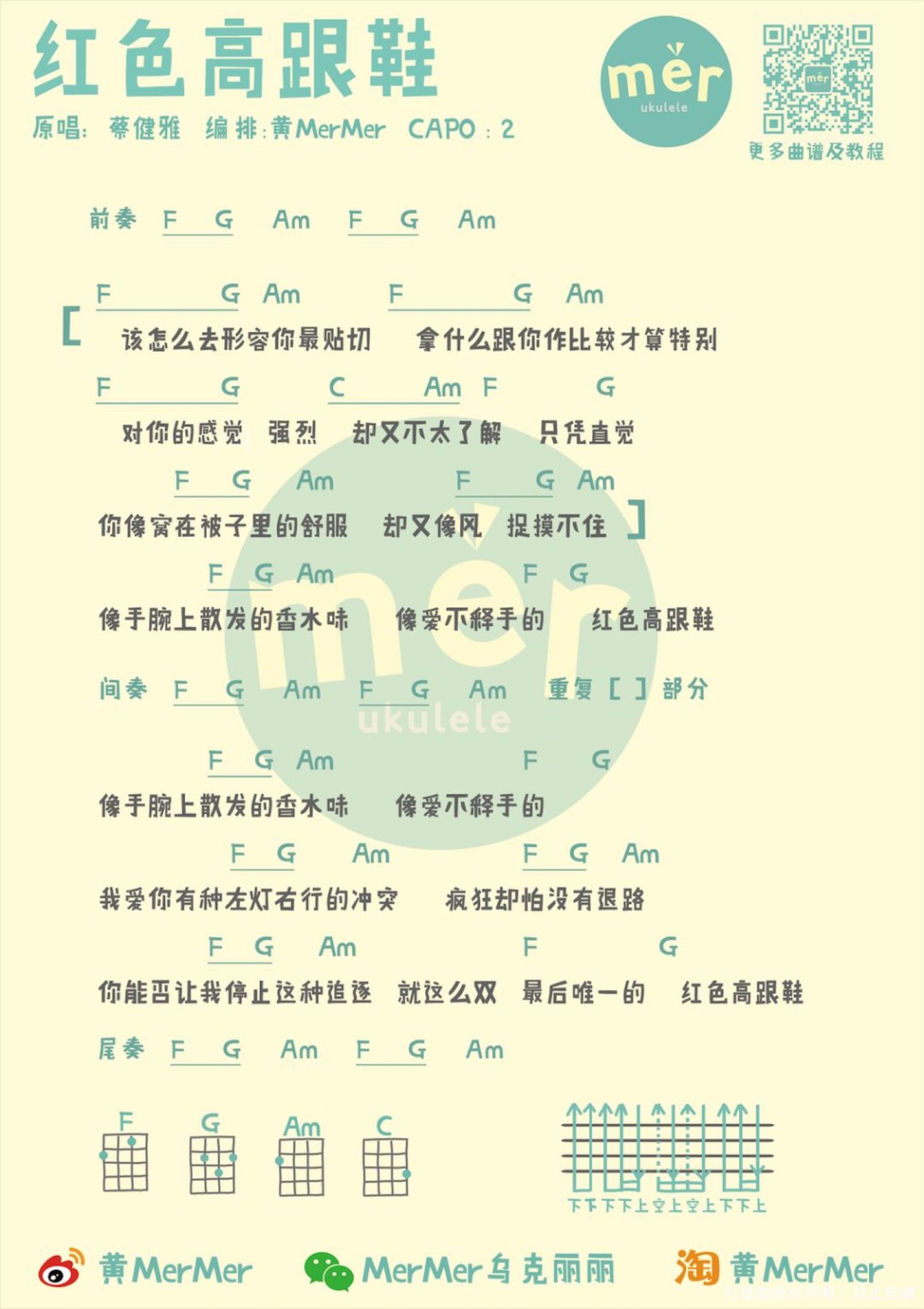 曲谱介绍: MerMer说 虽然我不喜欢红色也不爱穿高跟鞋哈哈哈哈哈,但我真的好喜欢这首《红色高跟鞋》,每次听都觉得洗脑中带着一种清风拂面的舒爽,当年也是因为这一首歌一秒喜欢上Tanya。今天就来简单教一下啦~ 推荐大家去看一下她录的“Tanya's弹吧吉他小教室”系列视频,你会发现她比你想象中的更可爱率性,很难不被圈粉! 弹唱COVER 教学 曲谱