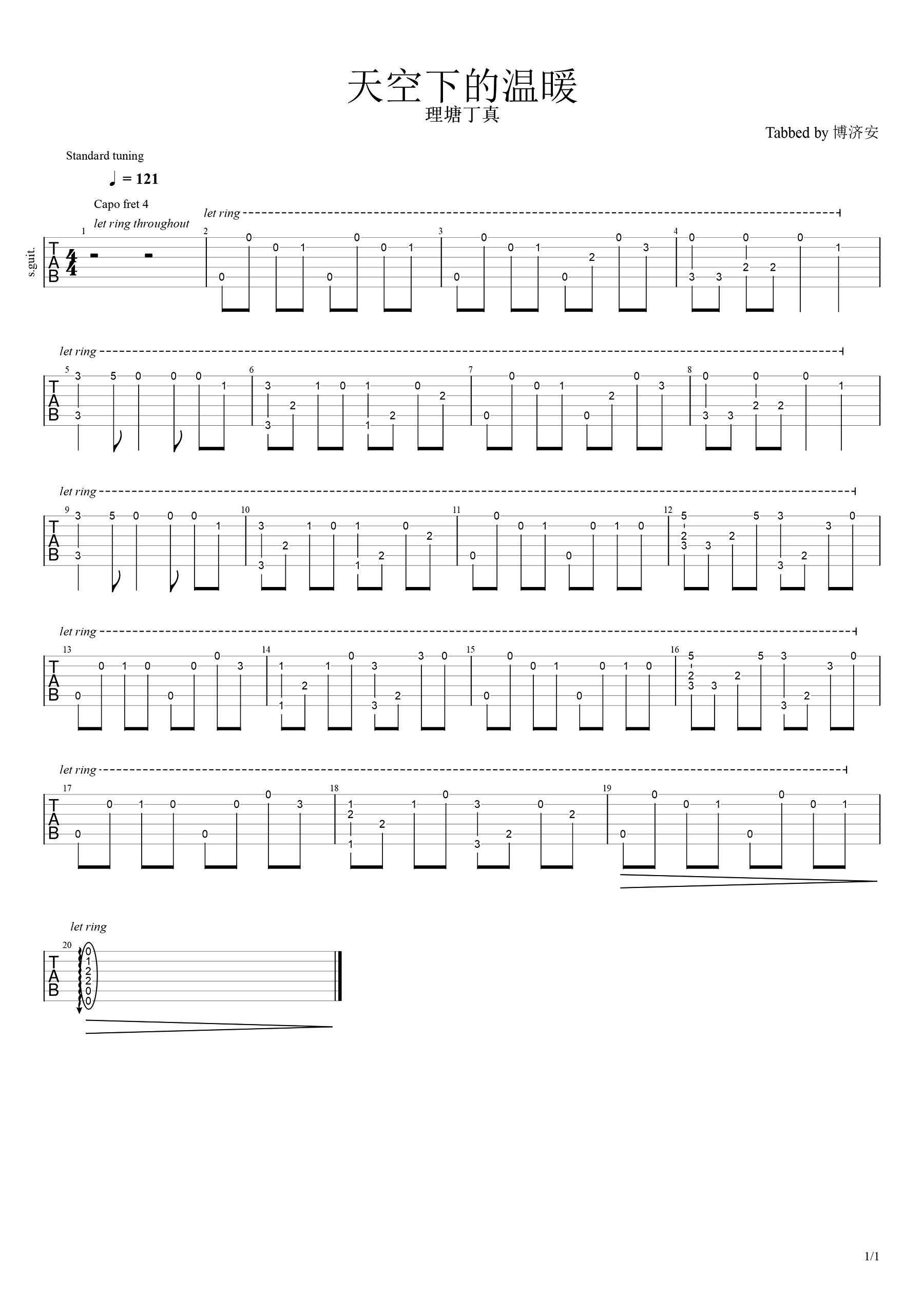 曲谱介绍: 天空下的温暖指弹谱,总共1张高清图片谱,由博济安编配,CAPO可以夹至4品处,速度121拍,指弹的难度不算太大,适合指弹新手作为练习曲目。