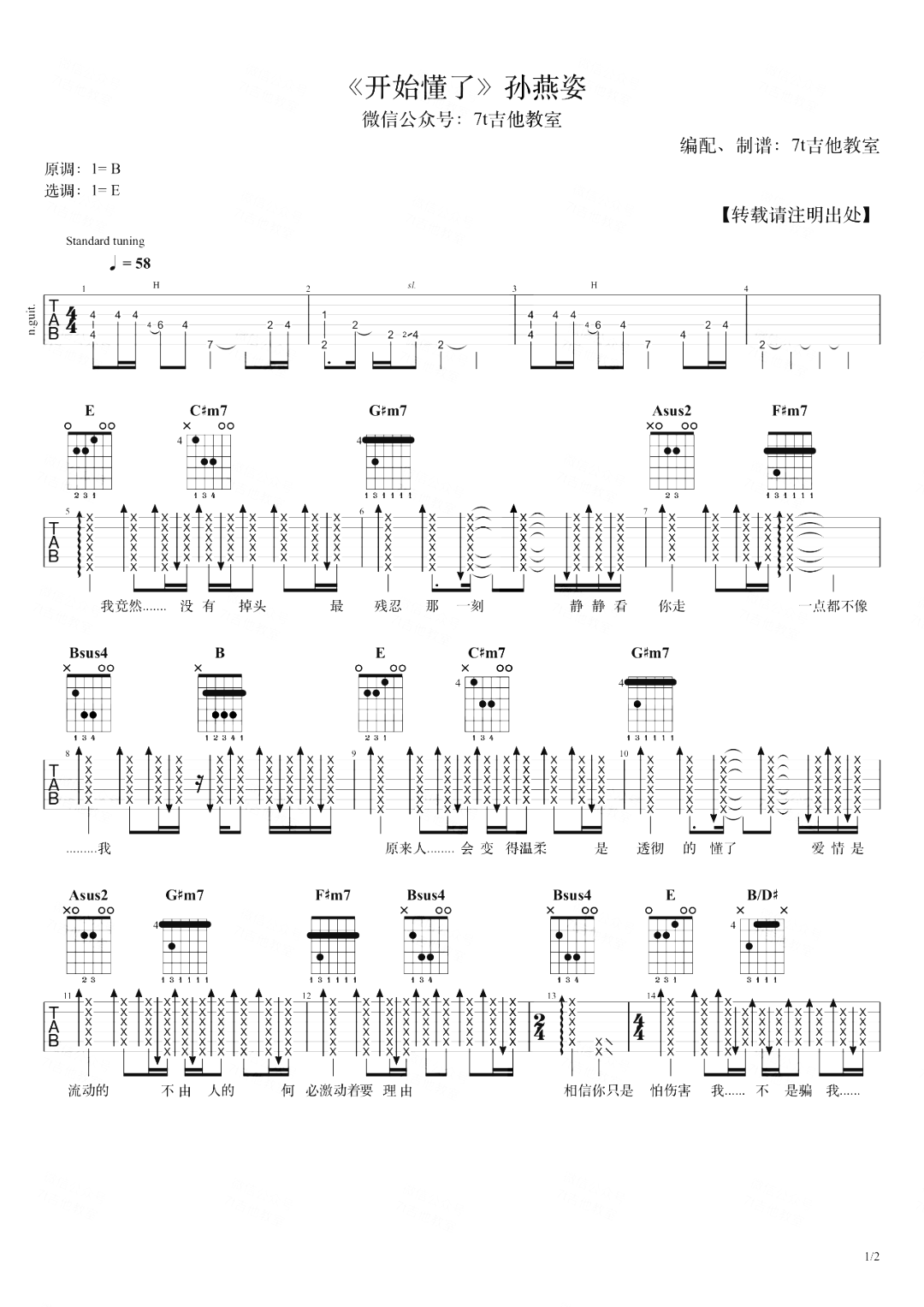 曲谱介绍: 吉他弹唱预览视频: 您的浏览器不支持。 《开始懂了》吉他弹唱谱,这首曲谱由7T吉他编配,原调是B调,选用E调指法,前奏完整,编曲比较精细,整体来说是适合大家练习弹唱的一个版本,吉他演示视频是由男生采用E调进行的弹唱,标准调音不用变调夹,大家可以参考吉他弹唱演示视频试听哦。