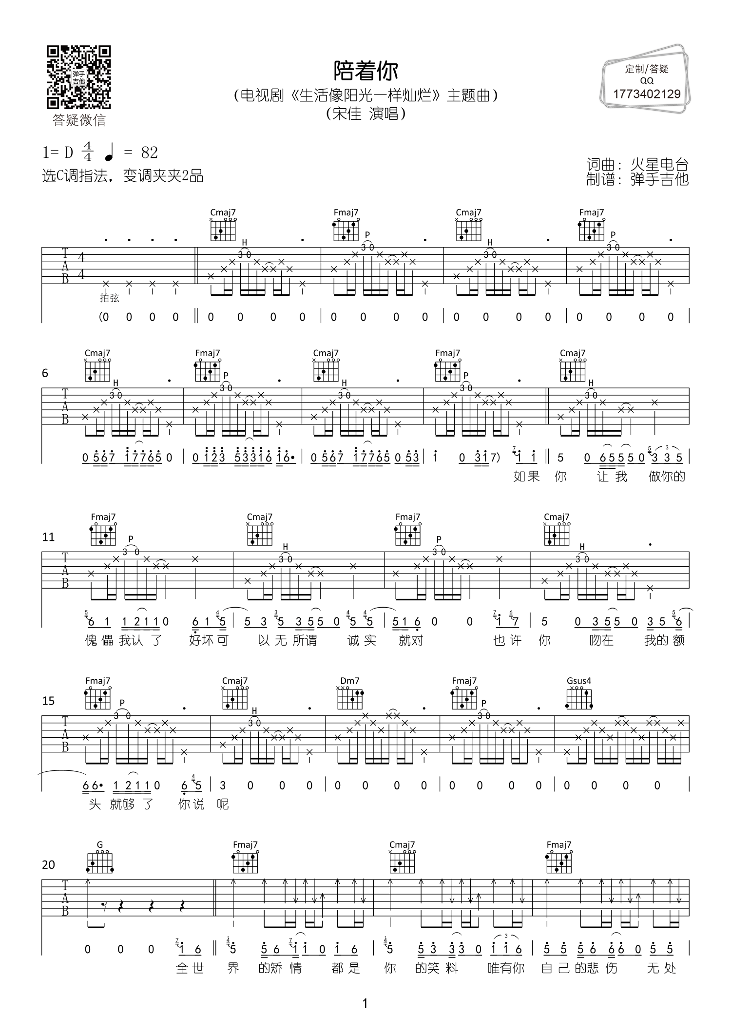 曲谱介绍: 曲谱总共3张高清图片谱,原调是D调,选用C调指法,变调夹夹2品弹唱原调,感兴趣的试弹一下吧。
