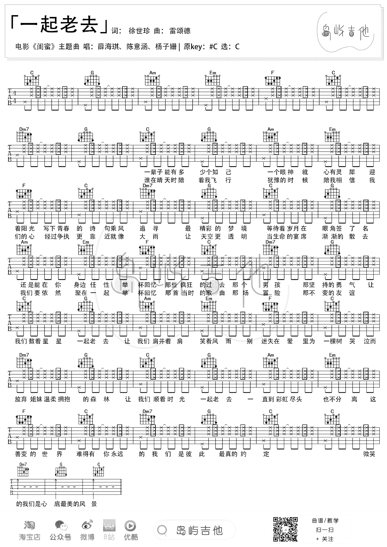 曲谱介绍: 这首曲谱由岛屿吉他制谱,原调是#C,选用C调指法,变调夹夹1品,曲谱中包含了拍弦的节奏技巧,弹唱中要好好的把握细节,下方分别有弹唱演示视频和教学视频,不太明白的伙伴,赶紧先试看试看吧! 《一起老去》吉他弹唱演示视频 《一起老去》吉他弹唱演示视频