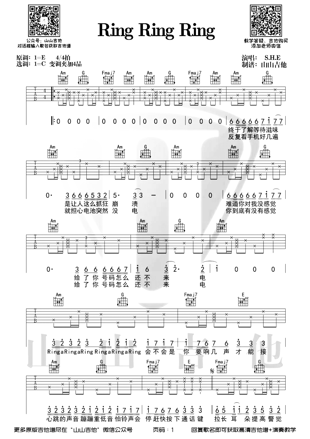 曲谱介绍: 这首曲谱是由山山吉他编配制谱,总共2张高清图片谱,原调是E调,选用C调指法,男生不用变调夹,女生可以夹至4品弹唱原调,可参考下方的弹唱演示视频,配合自己练习。 《ring ring ring》吉他弹唱演示视频