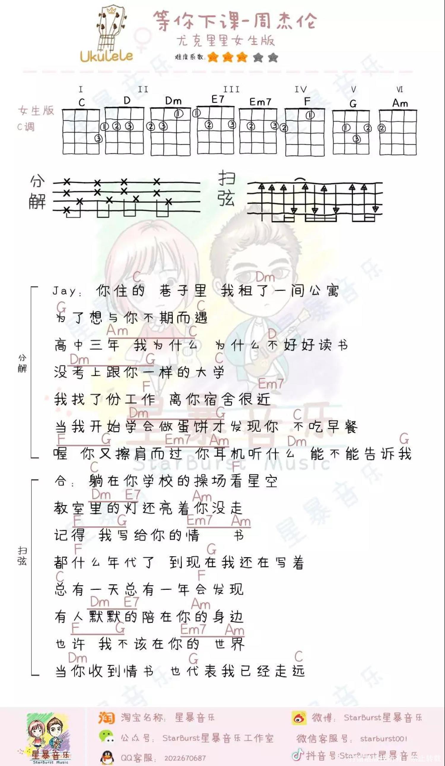 曲谱介绍: 周杰伦在七天内完成配唱、音乐制作、歌词版MV 。周杰伦选择在2018年的生日这天用该曲跟歌迷一起度过 。歌曲上线15小时在QQ音乐平台播放量突破2250万次 。 截止到2018年3月1日,《等你下课》在网易云上的评论已经正式超过100万。也让周杰伦成为唯一拥有两首百万评论歌曲的歌手 。   尤克里里男生版 尤克里里女生版