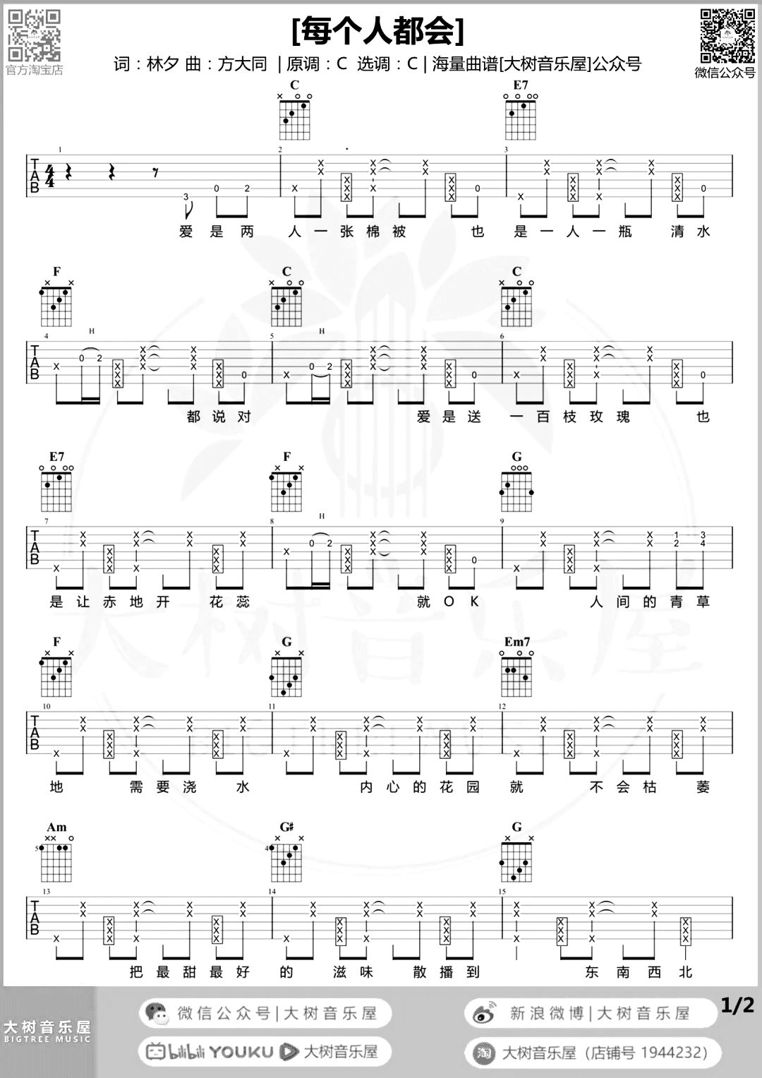每个人都会吉他谱 - 方大同 - C调吉他弹唱谱 - 原版