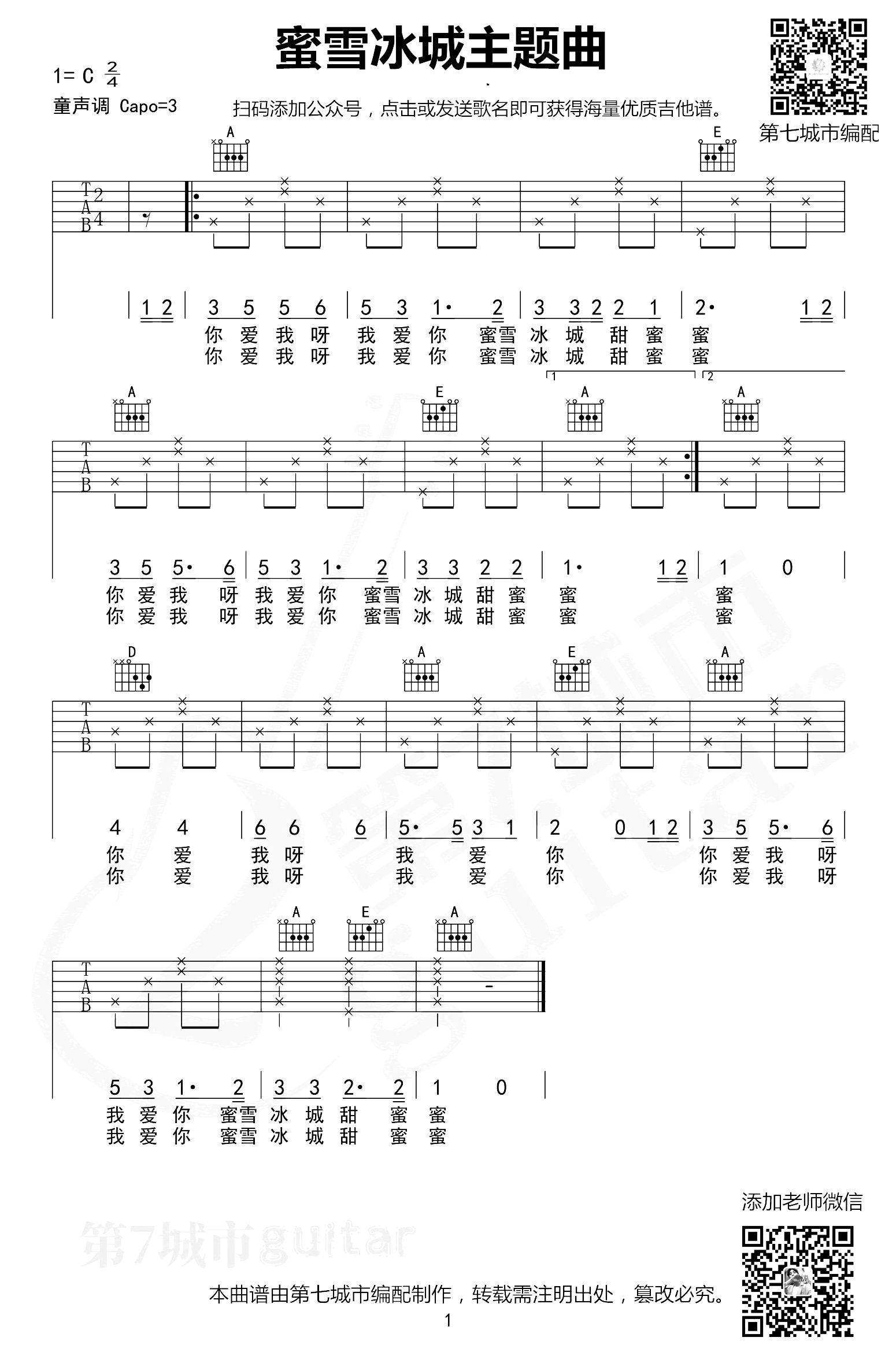 曲谱介绍: 这首曲谱是由第七城市编配,选用C调指法,建议弹唱原调—童声调,变调夹夹3品即可,指法和和弦都是十分的简单,所以上手也十分的容易。