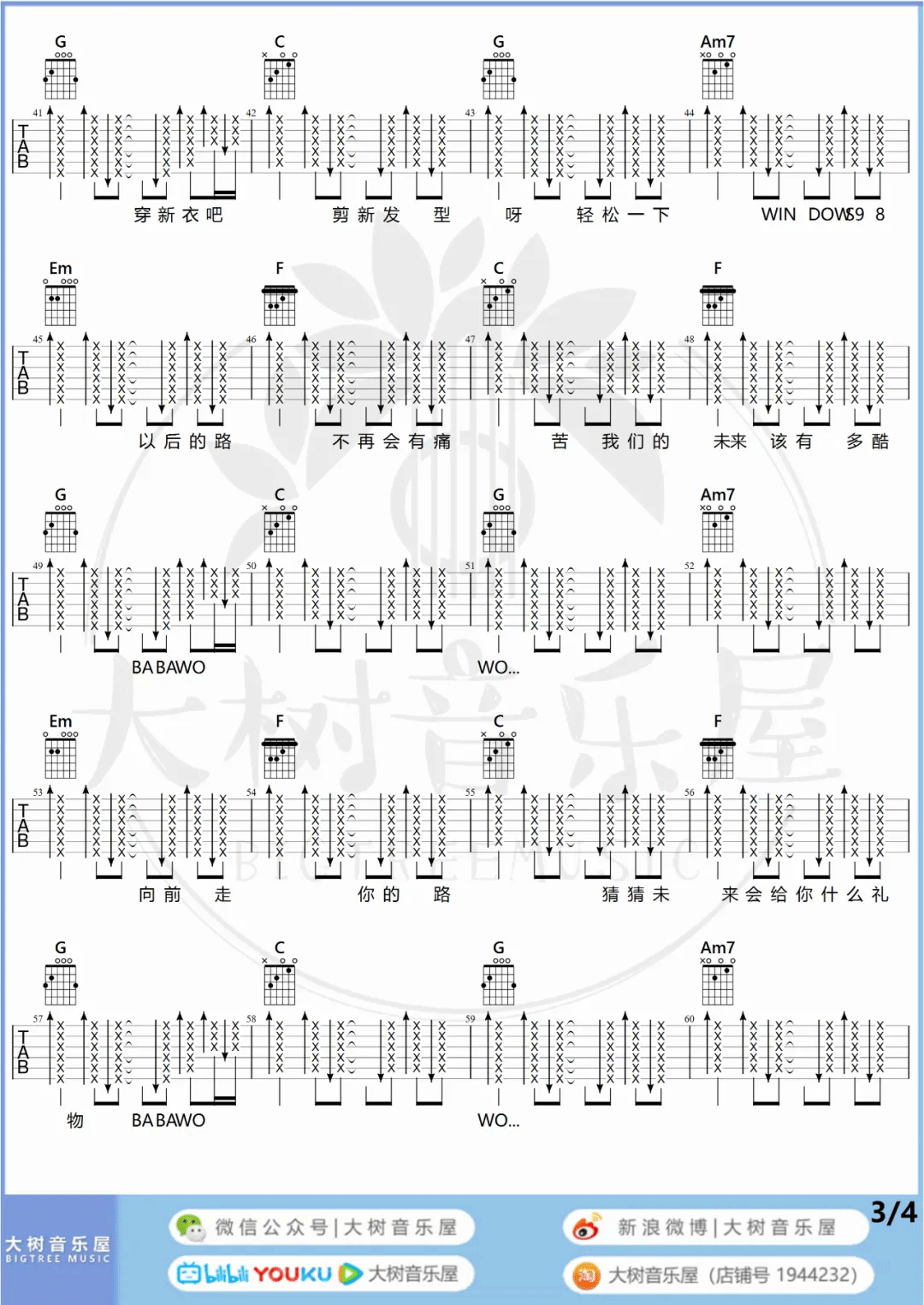 曲谱介绍: 这首曲谱由大树音乐屋编配制谱,总共4张高清图片谱,原调是D调,选用C调指法,变调夹夹2品可以变回原调,全曲谱使用扫弦节奏贯穿,大家在弹唱的时候注意把握好节奏的层次感,建议参考演示和教学视频,便于更好的弹唱这首歌曲。 《New Boy》吉他弹唱演示视频 《New Boy》吉他弹唱教学视频