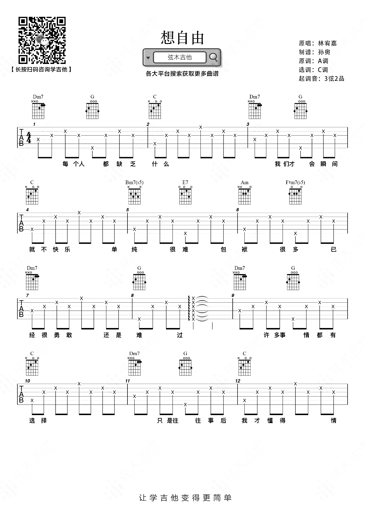 曲谱介绍: 《想自由》吉他弹唱谱,总共2张高清图片谱,由弦木音乐编配制谱,弹唱难度不大,比较适合初级水平的练习,不过新手同样可以参考下方的教学视频配合练习。 《想自由》吉他弹唱教学视频