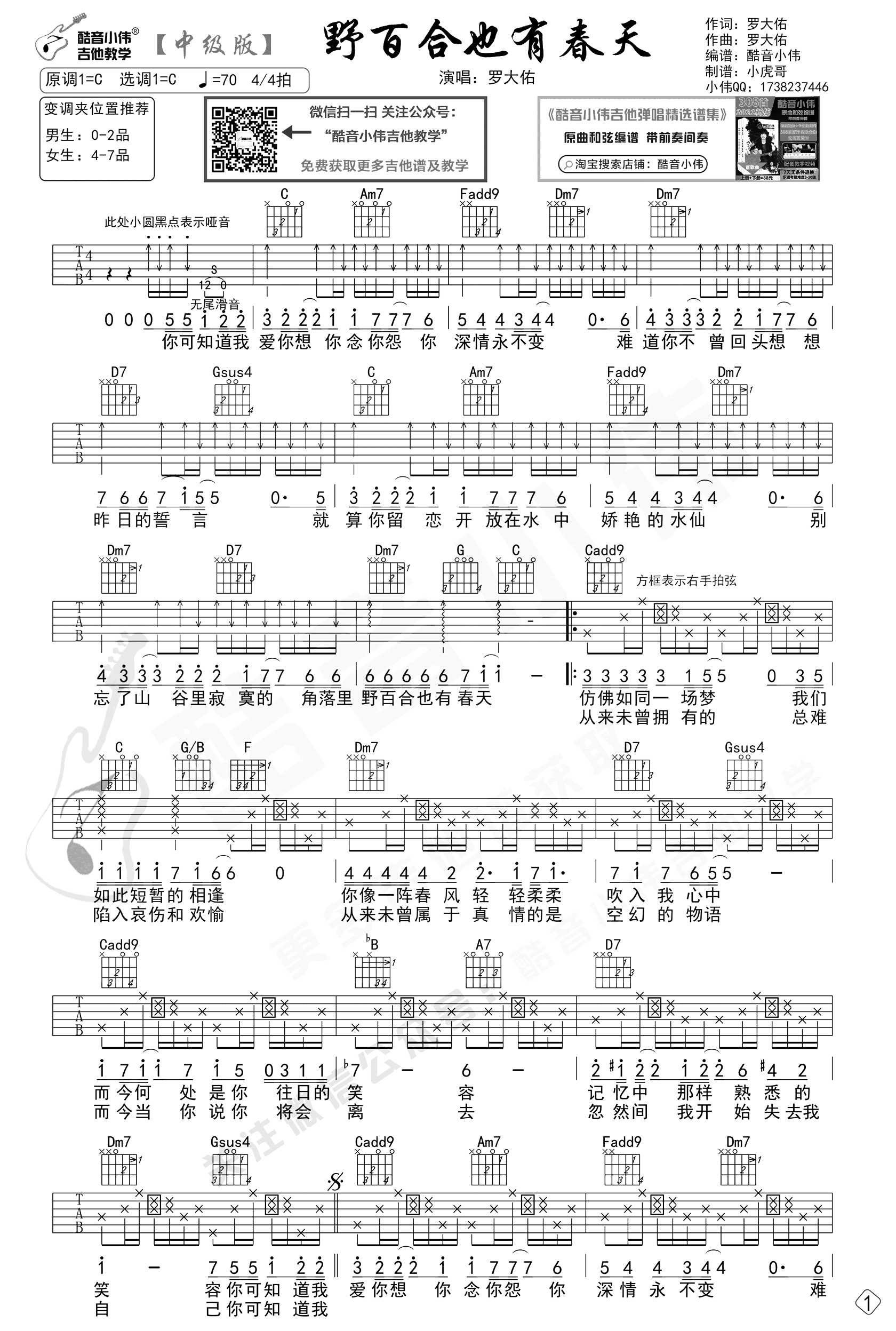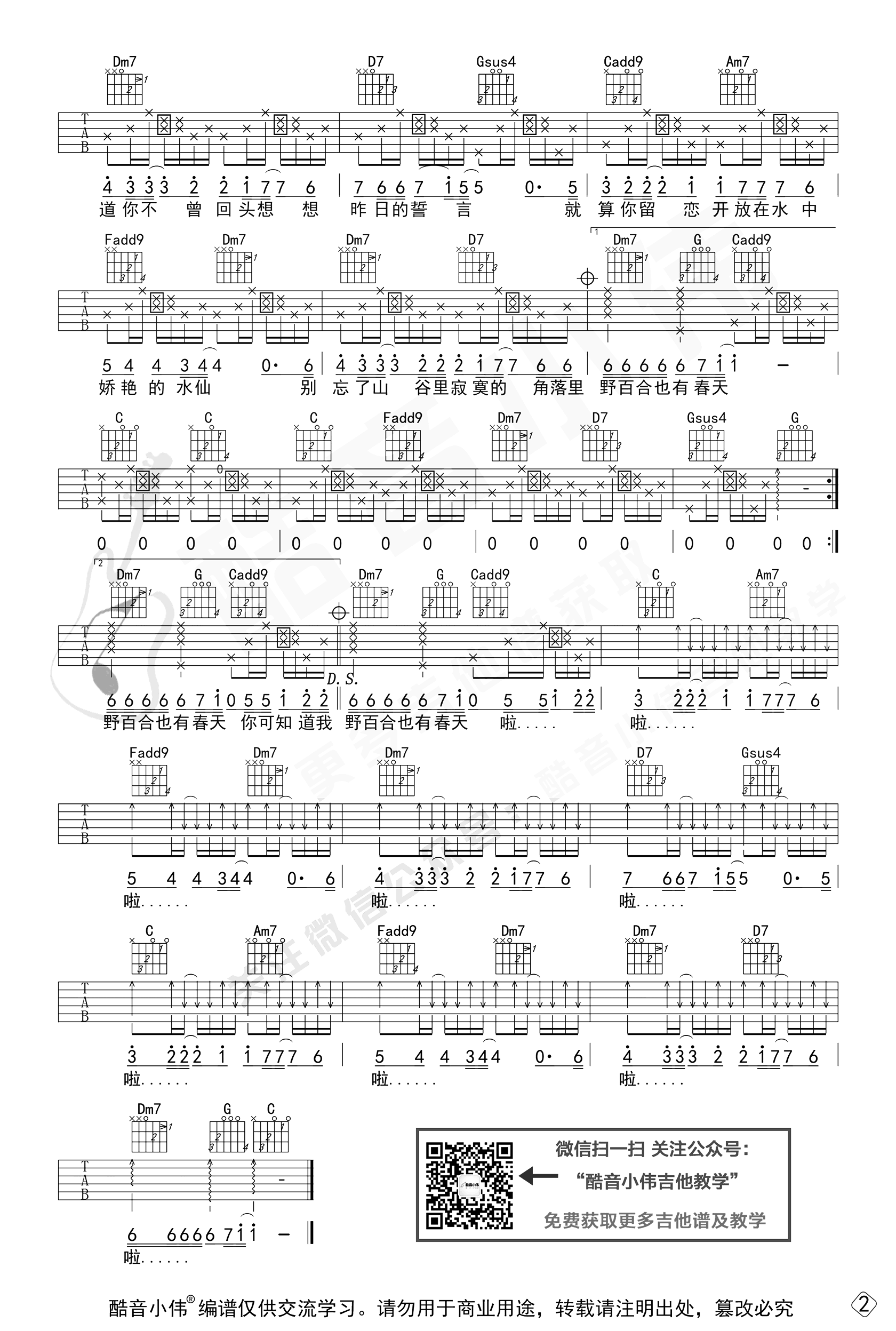 曲谱介绍: 这首曲谱总共2张高清图片谱,由酷音小伟编配制谱,原调C调,选用C调指法,男生0-2品,女生4-7品,建议大家可以参考小伟老师的教学视频结合练习。 《野百合也有春天》吉他弹唱教学视频