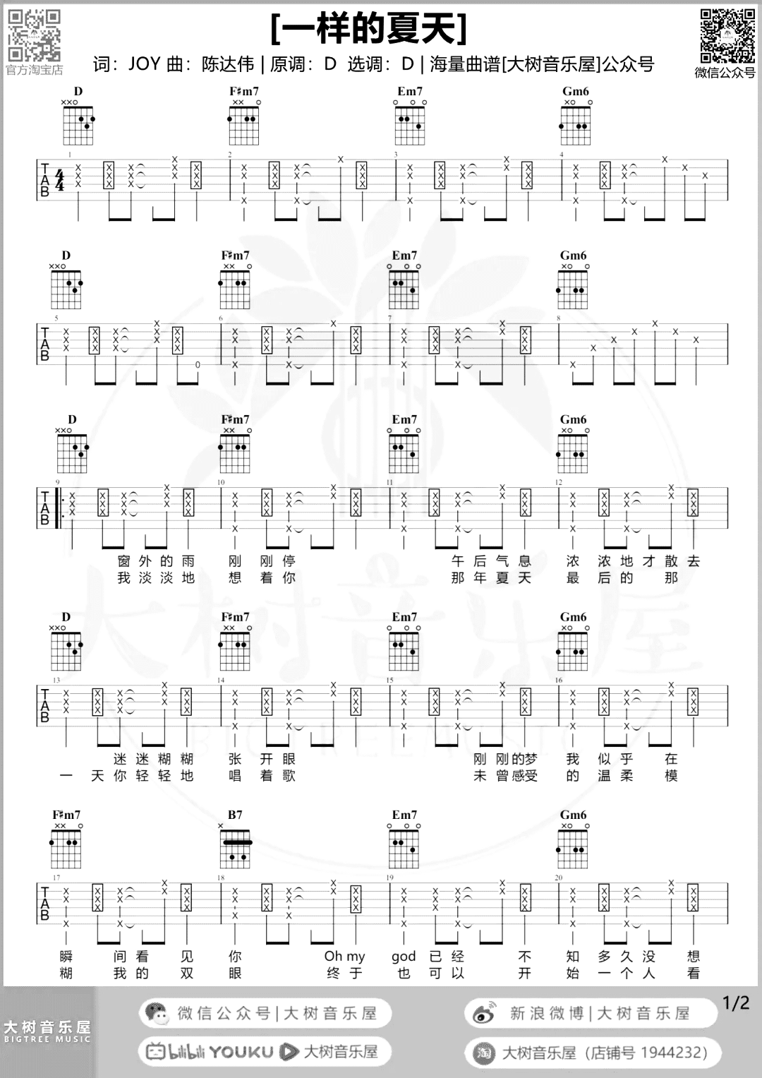 曲谱介绍: 《一样的夏天》吉他弹唱谱由大树音乐屋编配制谱,总共2张高清图片谱,选用D调指法,原调也是D调,谱子用到了拍弦的技巧,也是整首歌曲的主线节奏,下方的演示和教学视频都有了,大家可以认真参考后练习哦。 《一样的夏天》吉他弹唱演示视频 《一样的夏天》吉他弹唱教学视频