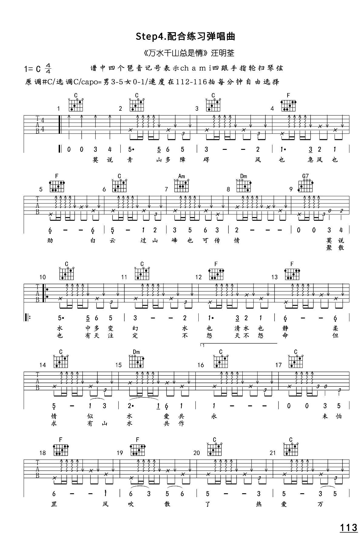 曲谱介绍: 这首曲谱由深蓝雨编配制谱,总共2张高清图片谱,选用C调,原调#C,男生3-5品,女生0-1品,速度在112-116拍,整体弹唱有一定的难度,和原版相比有一定的改编,节奏会略显跳跃和欢动,由男生版进行弹唱演示,下方视频大家可以在练习时多加参考。 《万水千山总是情》吉他弹唱演示视频