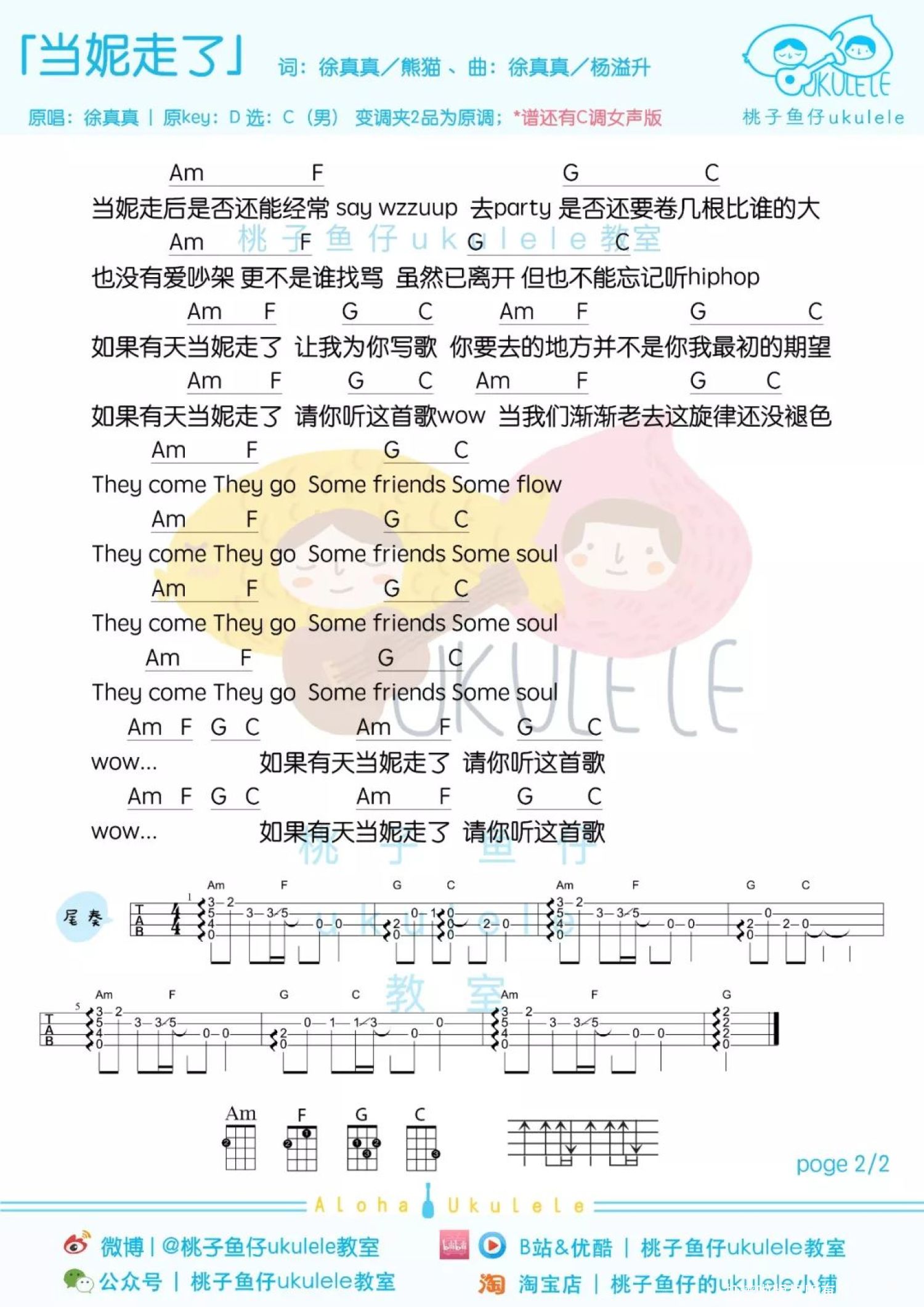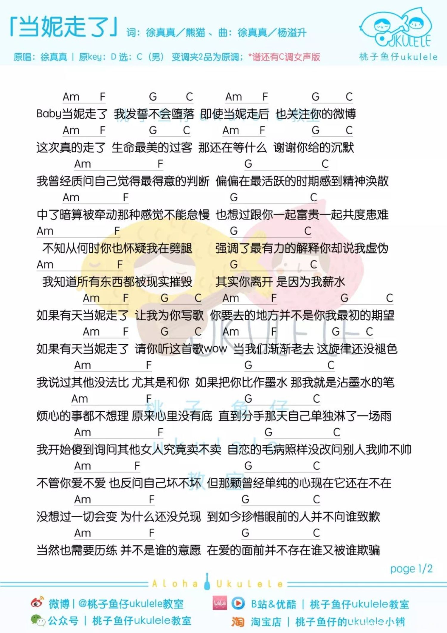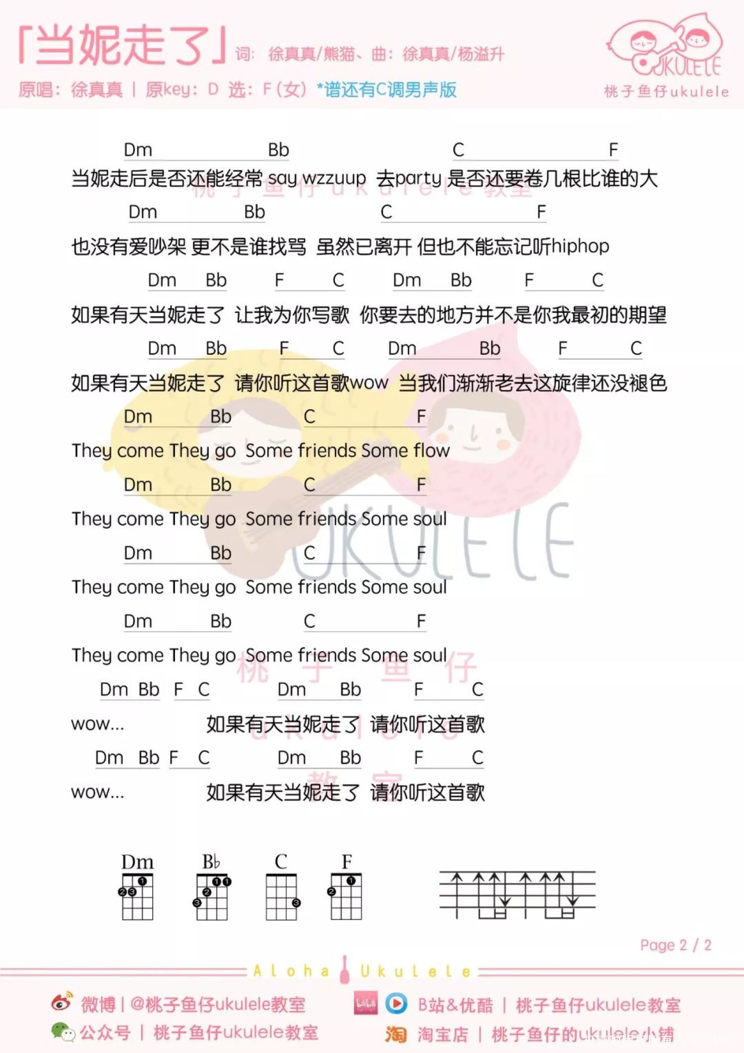曲谱介绍: 「当妮走了」尤克里里弹唱谱 1、女声版   2、男声版