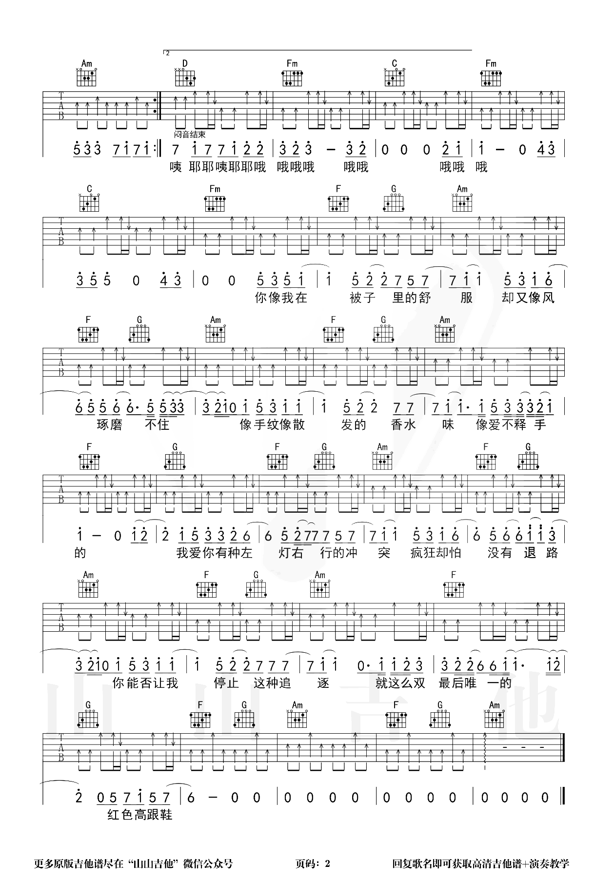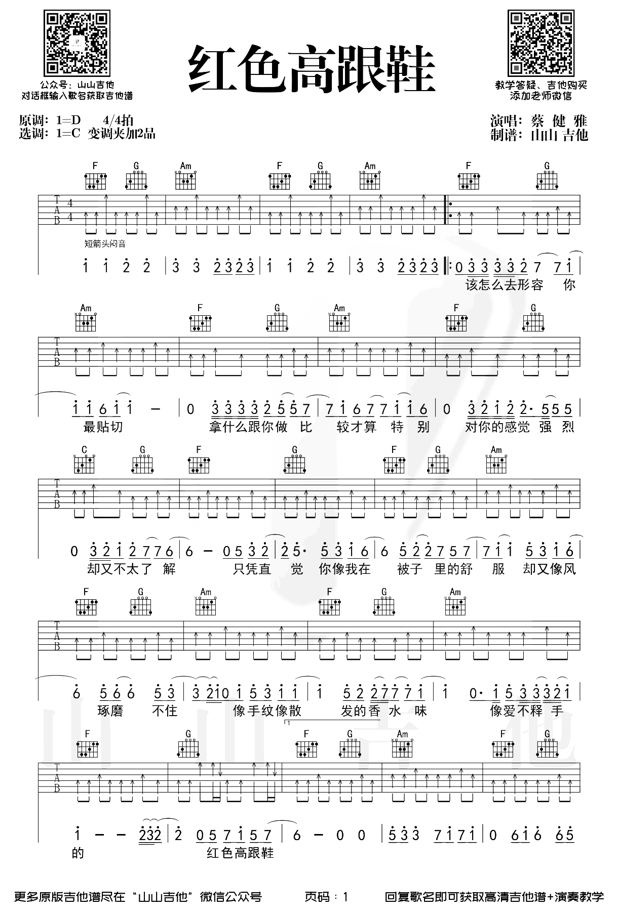 曲谱介绍: 这首曲谱由山山吉他编配制谱,原调D调,选用C调指法,变调夹夹2品弹唱原调,全谱是采用了这首歌曲的原版节奏,所以还是一个非常不错的版本。 整个弹唱以扫弦节奏贯穿,必须要用到的闷音技巧在这首歌曲中更是不可缺少,“闷闷开闷”是唯一的节奏型,大家把这个变化手感练习熟练即可,不太明白的可以参考下方的教学视频。 《红色高跟鞋》吉他弹唱教学视频