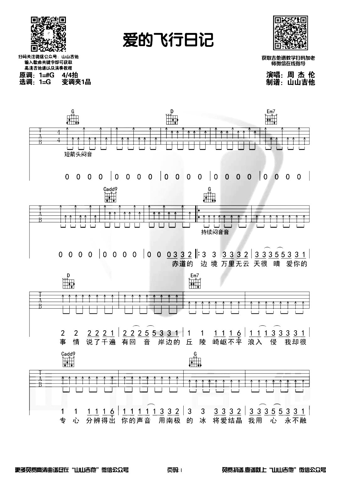 曲谱介绍: 周杰伦《爱的飞行日记》吉他谱,由山山吉他编配制谱,总共3张高清图片谱,全曲谱由扫弦节奏贯穿,也比较符合原曲的版本,大家可能前面多需要练习一下扫弦的层次感和律动性会帮助更好的弹唱这首歌。