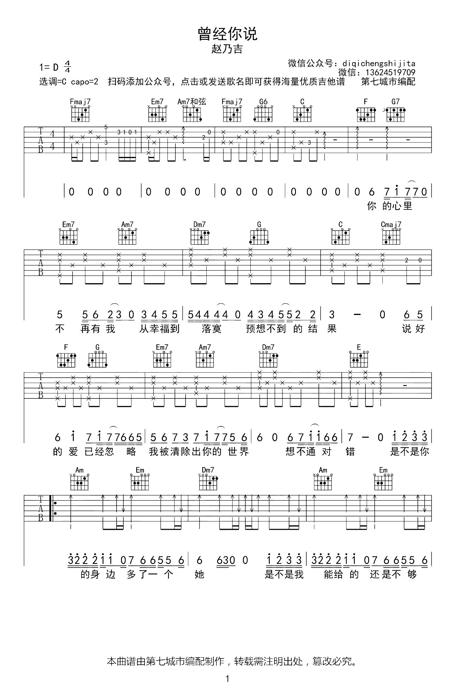 曾经你说吉他谱 - 赵乃吉 - C调吉他弹唱谱 - 原版