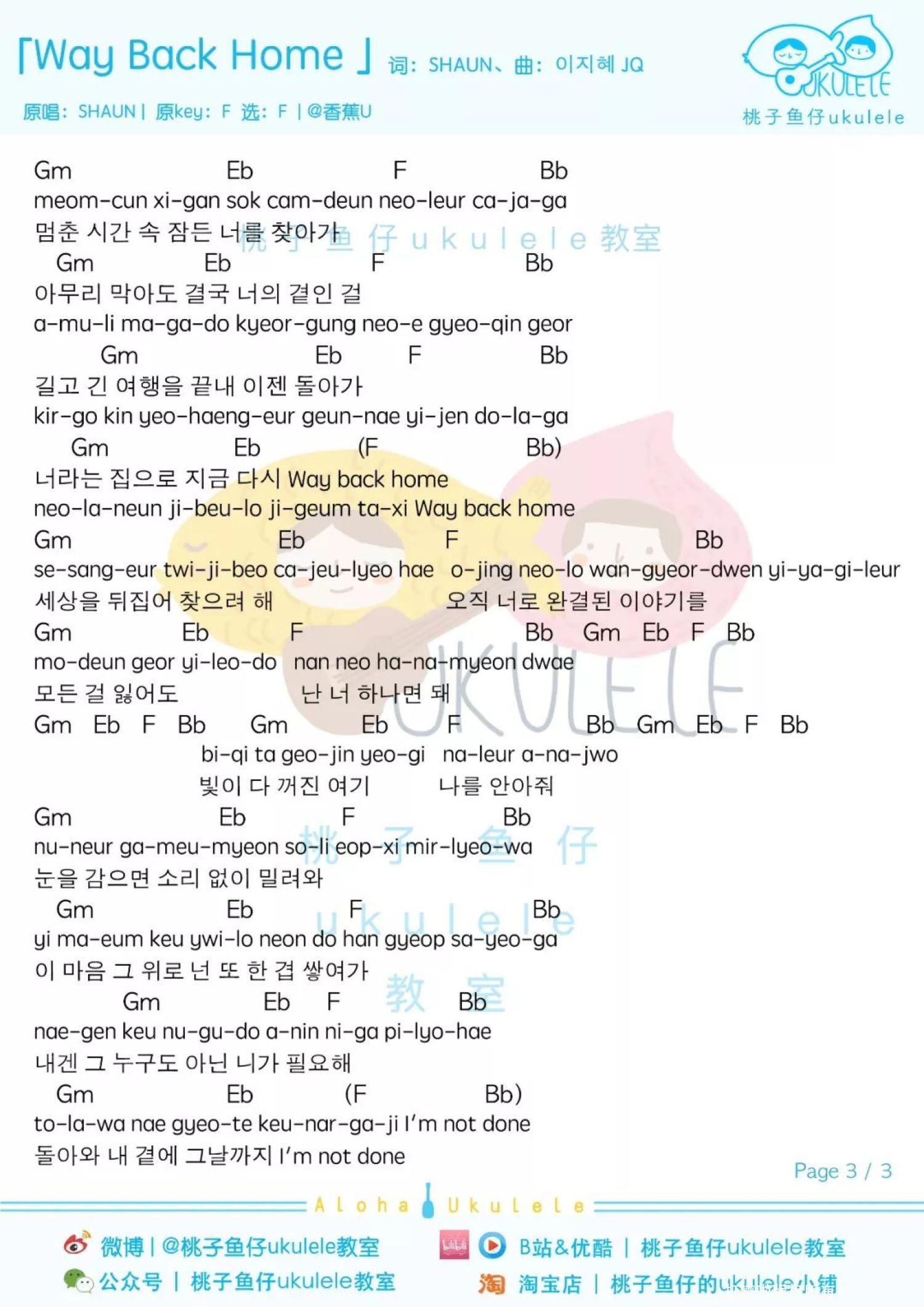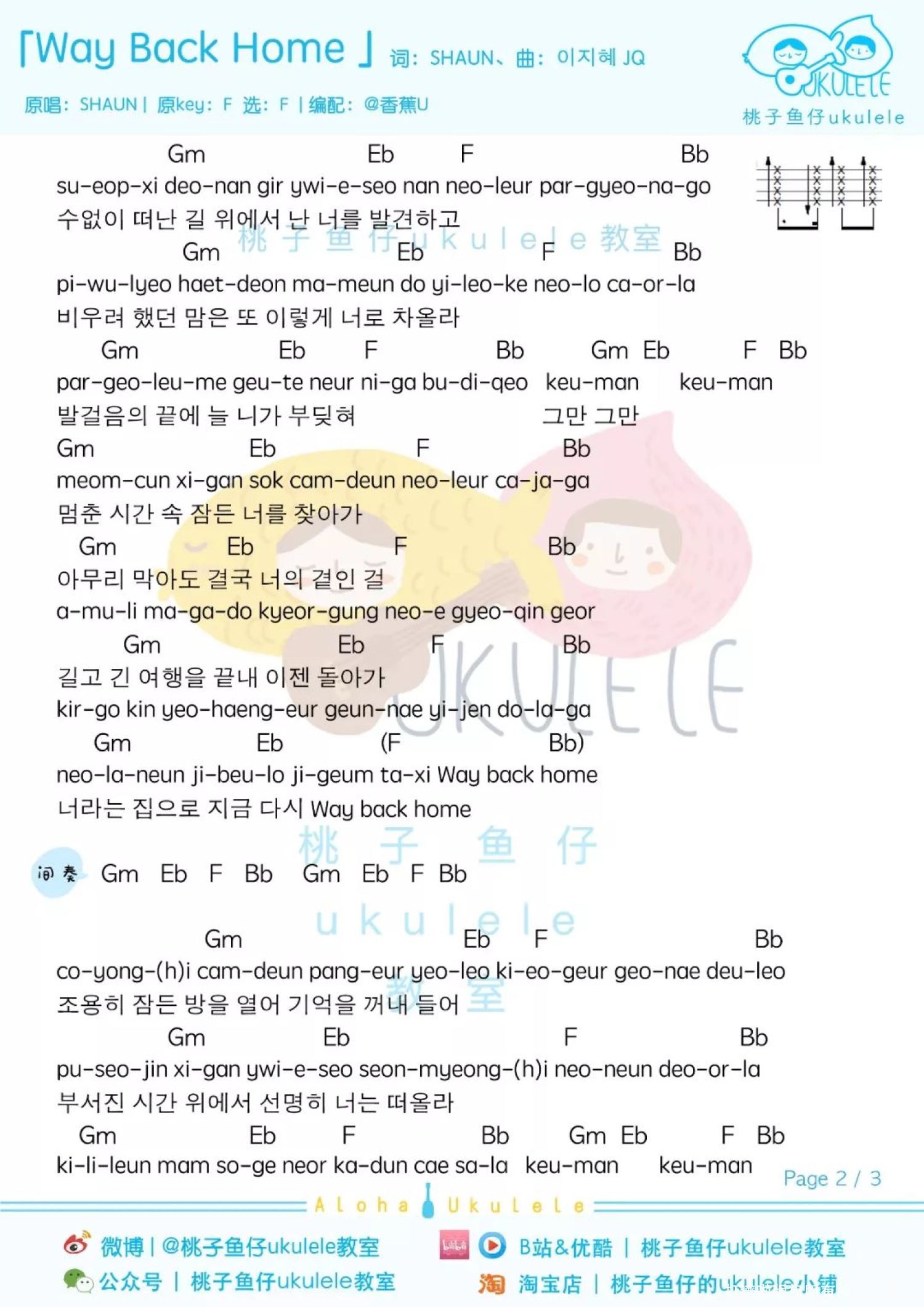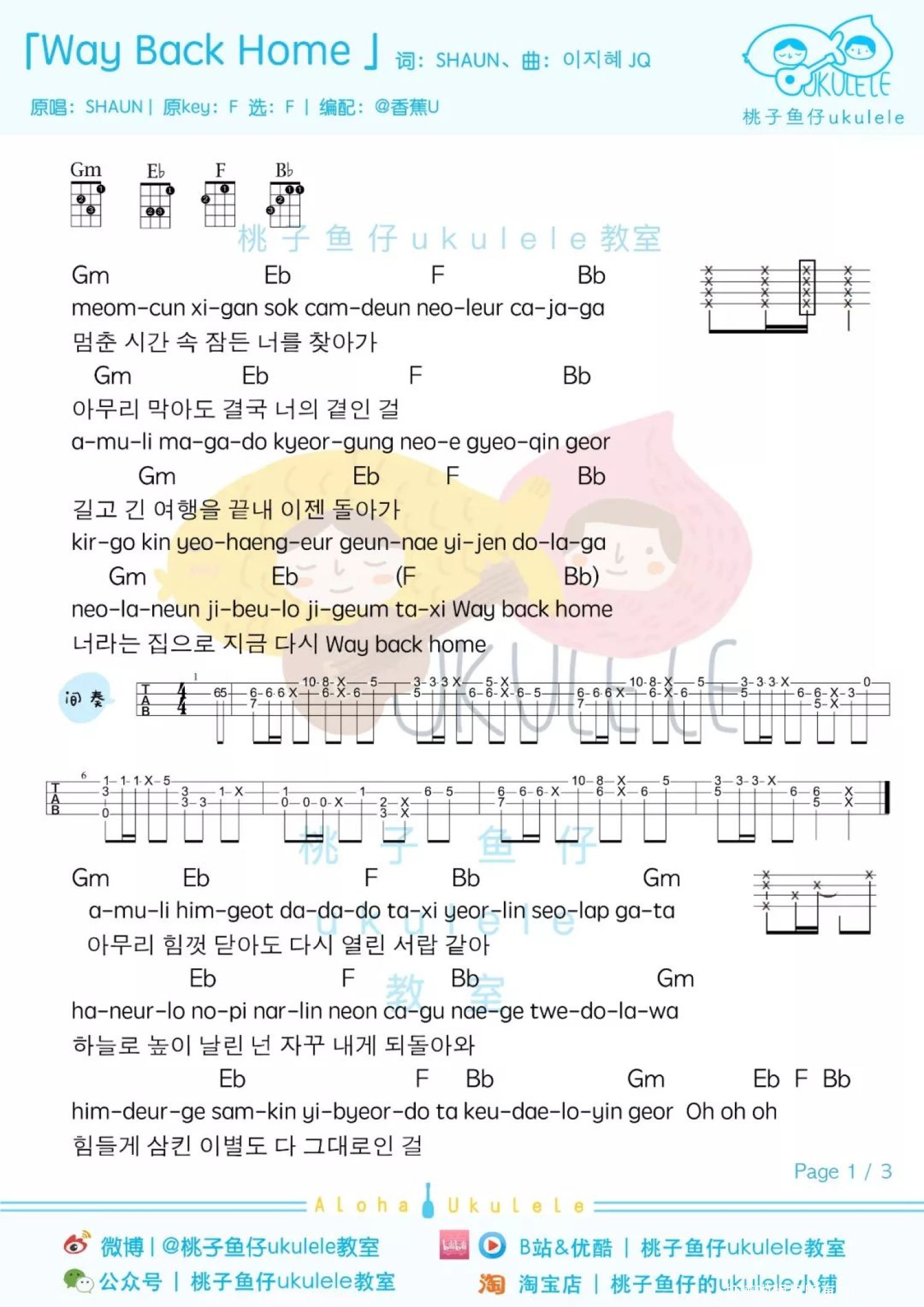 曲谱介绍: MV : Way Back Home (纯演奏版) ukulele+吉他 弹唱演示 ukulele弹唱教学 曲谱 目录 最初听到这首歌是在韩剧《我的ID是江南美人》的一个片段里,当旋律一响起时我就马上被吸引了, 好像就是等了很久的东西突然来临的感觉,欢喜和愉悦中所有的不安都落荒而逃。 这首歌真的很耐听,越听越甜,莫名心动。 不仅有着英文歌的轻快,同时又有着韩文独特的韵味。   MV : Way Back Home (纯演奏版) 纯演奏版简直了!超好听!直接循环100遍~~   ukulele+吉他 弹唱演示   ukulele弹唱教学   曲谱