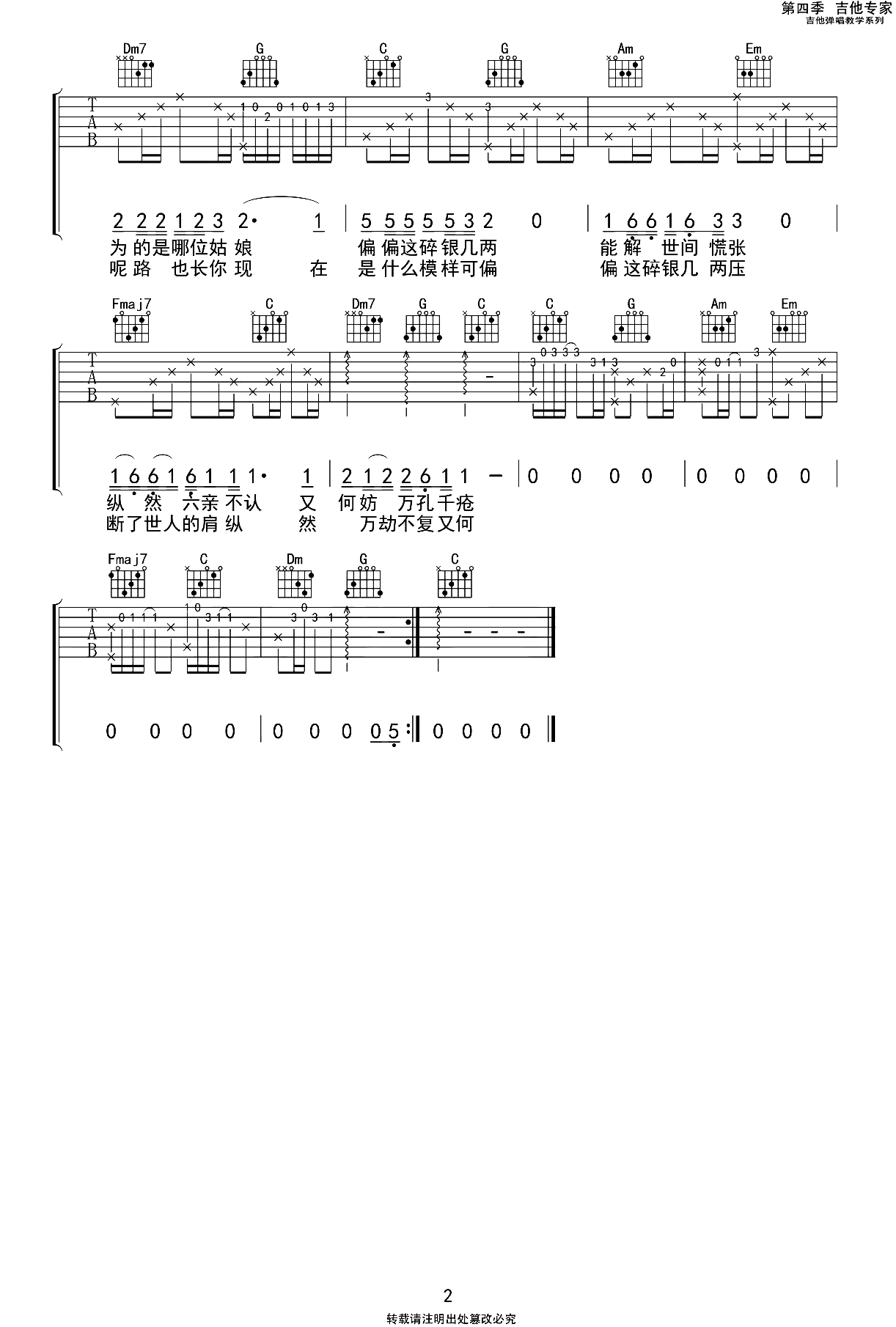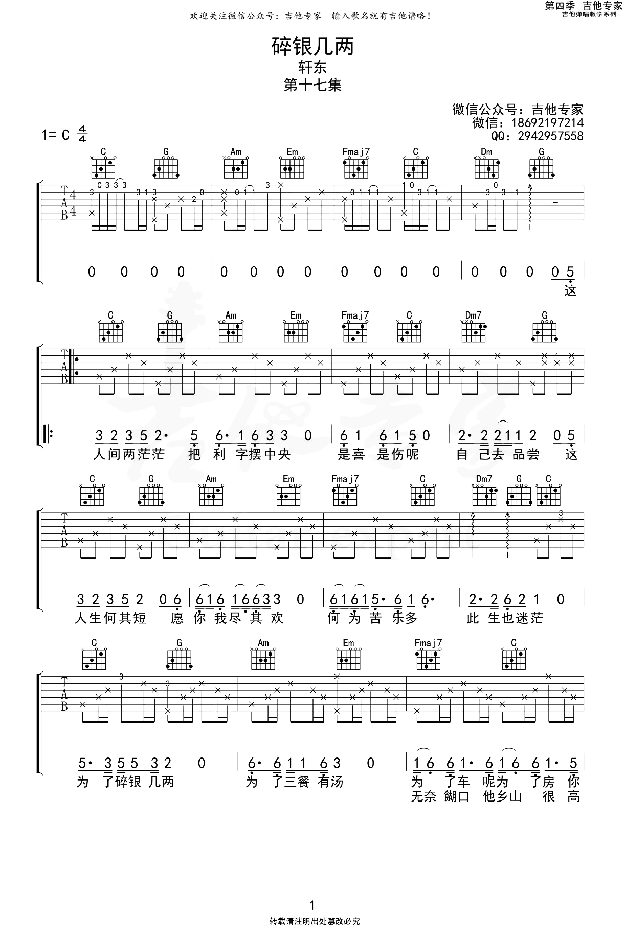 曲谱介绍: 《碎银几两》这首吉他弹唱谱,由吉他专家编配分享,总共2张高清图片谱,选用C调指法,标准调弦不用变调夹,包含着完整的前奏,弹唱难度不大,除了把握好前奏部分,其他地方都是很好上手的。