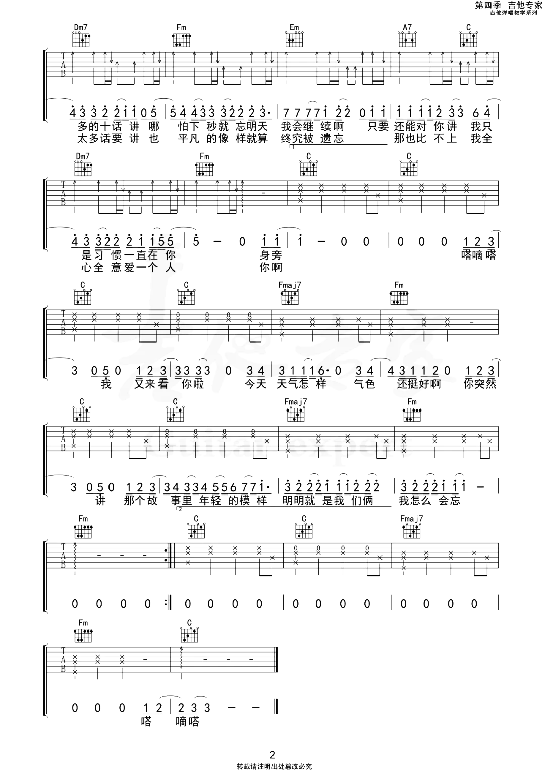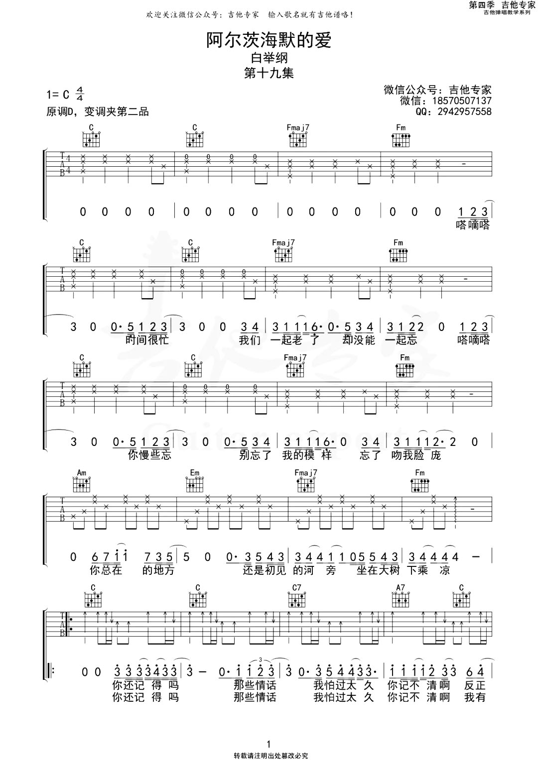 曲谱介绍: 《阿尔茨海默的爱》吉他弹唱谱,总共2张高清图片谱,原调是D调,选用C调指法,变调夹夹2品处可以弹唱原调,整体难度不大,需要把握的就是弹唱之间的融合。