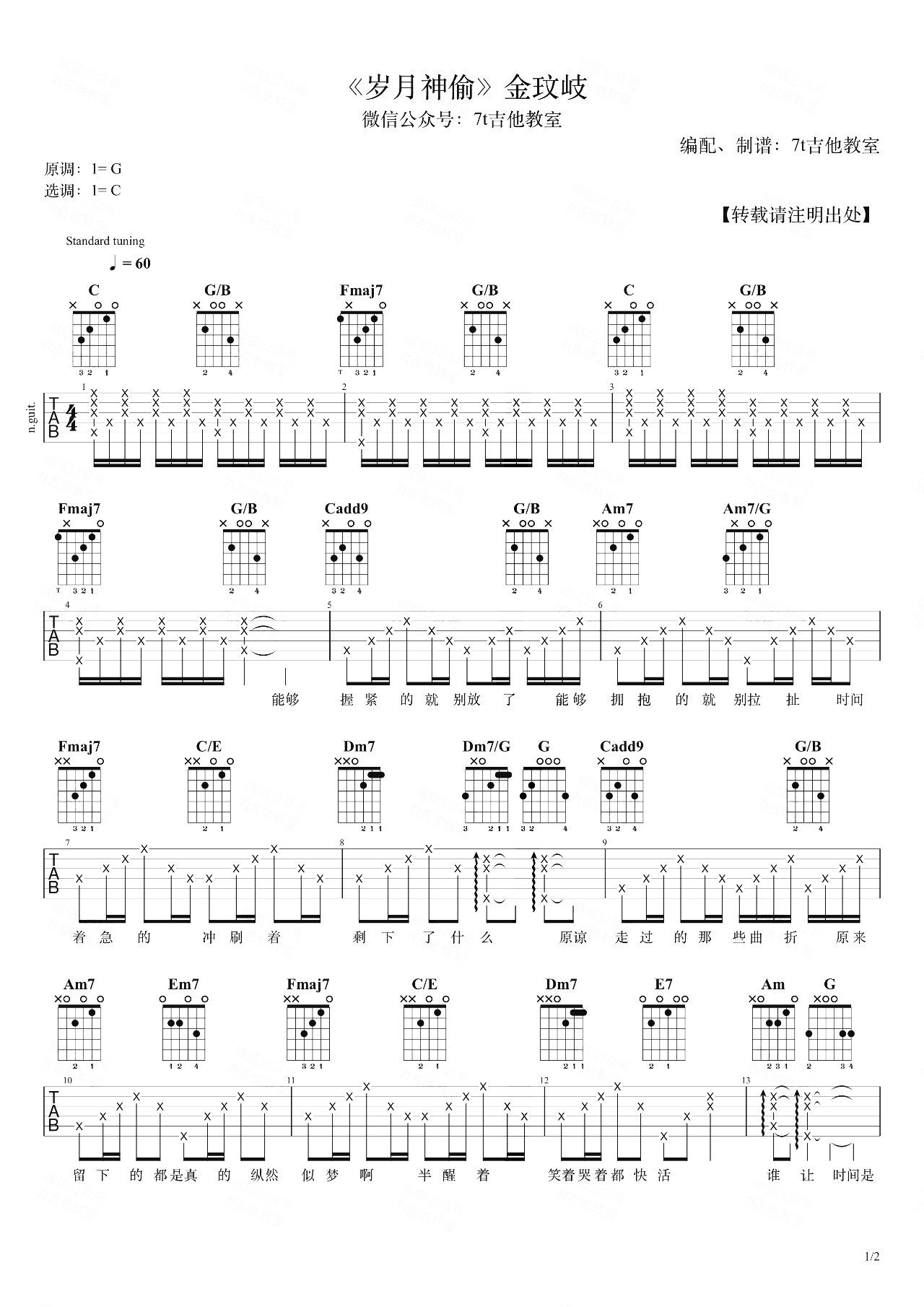 曲谱介绍: 金玟岐《岁月神偷》吉他谱,总共2张高清图片谱,由7T吉他教室编配,原调是G调,选用C调指法,男生可以不用变调夹直接弹唱C调,包含的演示视频也是标准调音由男生版演唱,大家可以参考老师的视频,整体还原度效果比较不错,同时,也比较适合初中级选手弹唱练习。 《岁月神偷》吉他弹唱演示视频