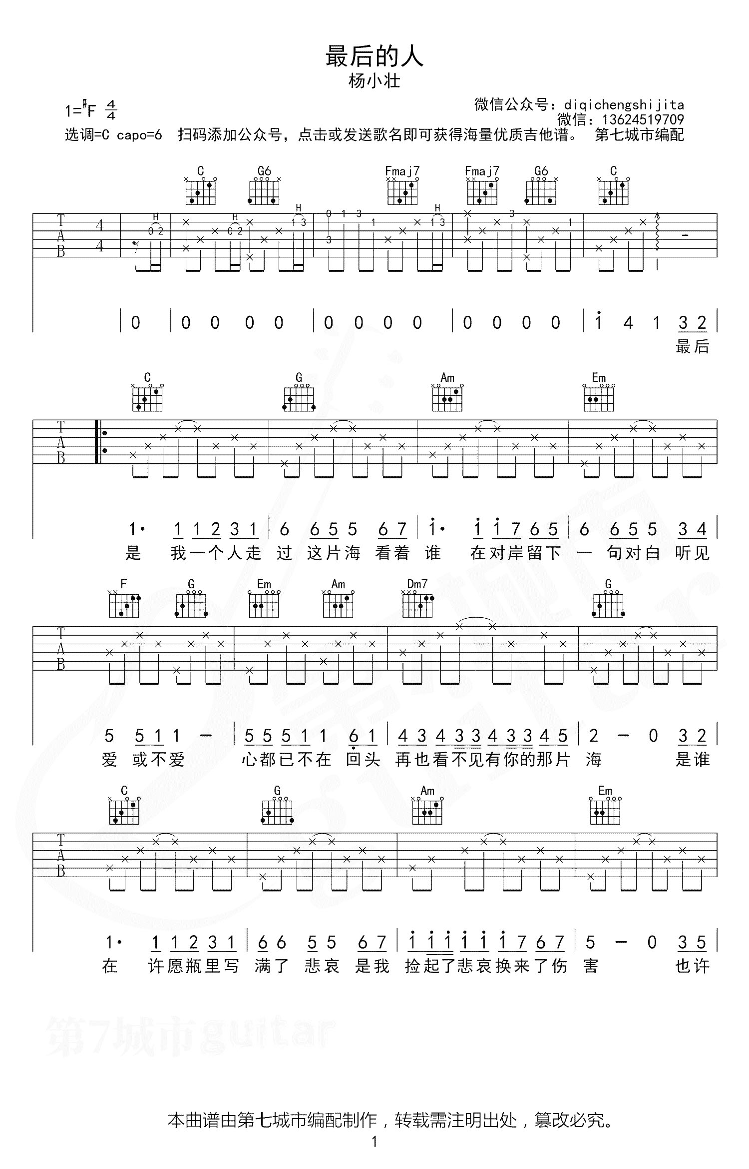 曲谱介绍: 杨小壮《最后的人》吉他弹唱谱,采用C调指法编配原版,共有3张高清图谱。