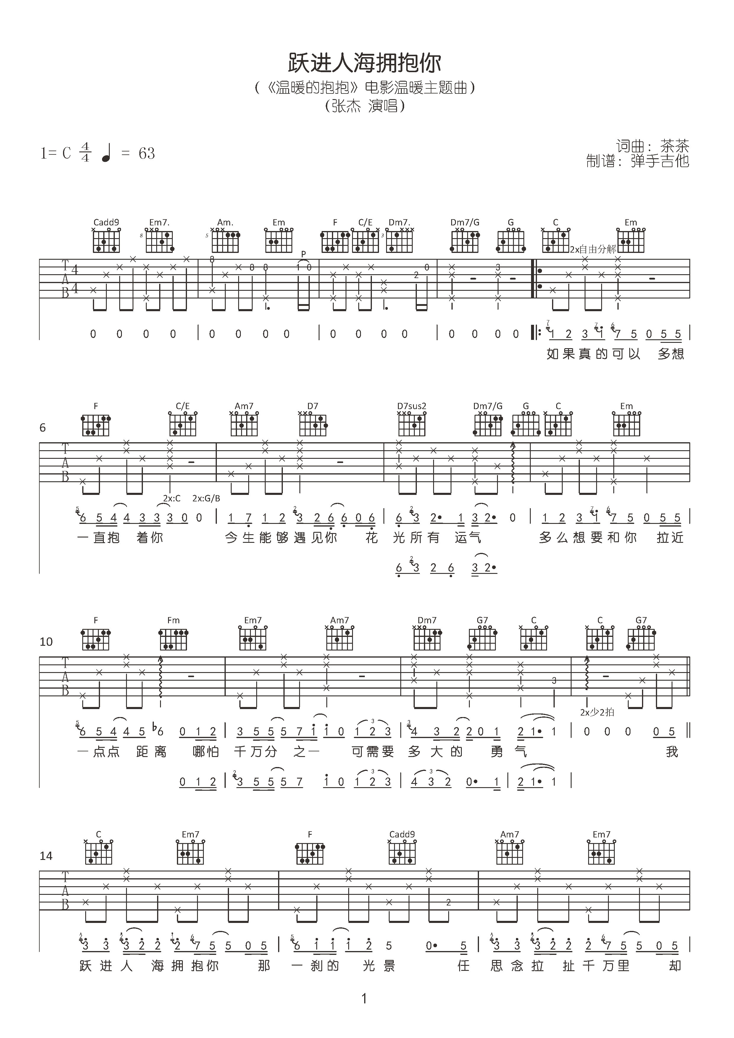 跃进人海拥抱你吉他谱 - 张杰 - C调吉他弹唱谱
